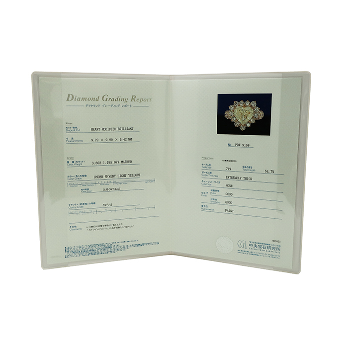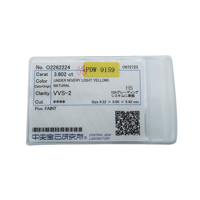 | ダイヤモンド | カラー:VLY(VERY LIGHT YELLOW) クラリティ:VVS-2 カット:HS(HEART MODIFIED BRILLIANT) |