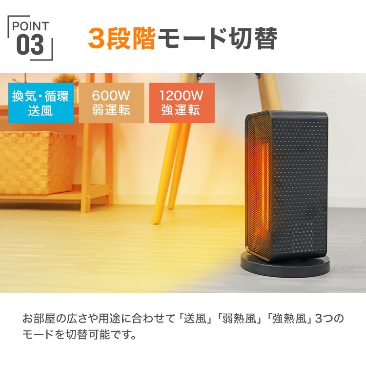 | ジョイントマットです。 5秒で速暖!! PTCセラミック仕様なのでスイッチONですぐに温風がでます! 左右90度まで首を振り広い範囲を暖めることができます お部屋の広さや用途に合わせて「送風」「弱熱風」「強熱風」の3つのモードを切替可能です!! 切タイマーは1~12時間まで1時間ごとに設定ができ、自動的に電源OFFになるので、消し忘れ防止にも役に立ちます!! 持ち手がついて約1.2kgの超軽量!! 女性やお年寄りの方でも簡単に持ち運ぶことができます!! シンプルデザインなので、お年寄りの方などでも簡単に操作することができます 【商品内容】 カラー:ブラック サイズ:(約)幅16×奥行16×高さ28cm 重量:(約)1.2kg 消費電力:最大1200W 電源:AC100V 50/60Hz コード長さ:(約)1.5m 素材:ABS樹脂/PTCセラミック 【注意事項】 ・不安定な場所や熱に弱い敷物の上で使用しないでください。 ・電源オフを押してから、約1分後に完全に停止します ・吹気口の前方に90cm以内には物を置いたり物が触れないよう必ずスペースを確保ください ・周囲温度が40度以上になる場所では使用しないでください ・雨や水に濡れる場所ではご使用にならないでください ・日光が直接当たる場所ではご使用にならないでください ・木くずやゴミ、ほこりの多い場所では使用しないでください ・吹き出し口へ子供を近づけないでください ・吹き出し口は高温になりますので触らないでください ・商品は、モニターによって色合いが異なって見える場合があります。 ・仕様・デザインは改良のため予告なく変更することがあります。 ・配達地域や交通事情等により、希望配達日時にお届けできない場合がございます。あらかじめご了承ください。 | ||