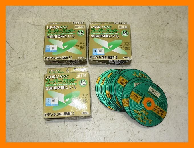 | 未使用・保管品です。 RESIBON レヂボン スーパーカット RSC 金属用 切断砥石 105×1.6×15 10枚入 3箱 他14枚 計44枚 写真に写っている物がすべての付属品になります。 (当方出品中の同型式商品は同じ画像を使用しております。外装汚れなどには若干の差異がございますので予めご了承ください。) | ||