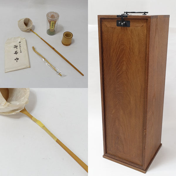 | 柄杓(破損あり)、茶杓、茶巾、茶筅、ナツメ、水差し、茶碗、蓋置、建水、9点です。 |