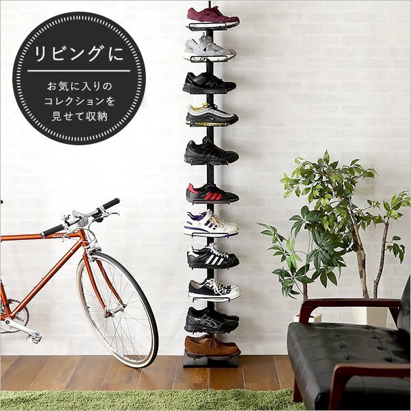 | 見せる収納の突っ張りシューズラック11段 お気に入りの靴を飾るディスプレイラックとしても、靴を収納するためのシューズラックとしてもお使いいただけます。 棚の高さ調節が可能なので、ハイカットやロングブーツでも容易に収納ができて便利です。 |