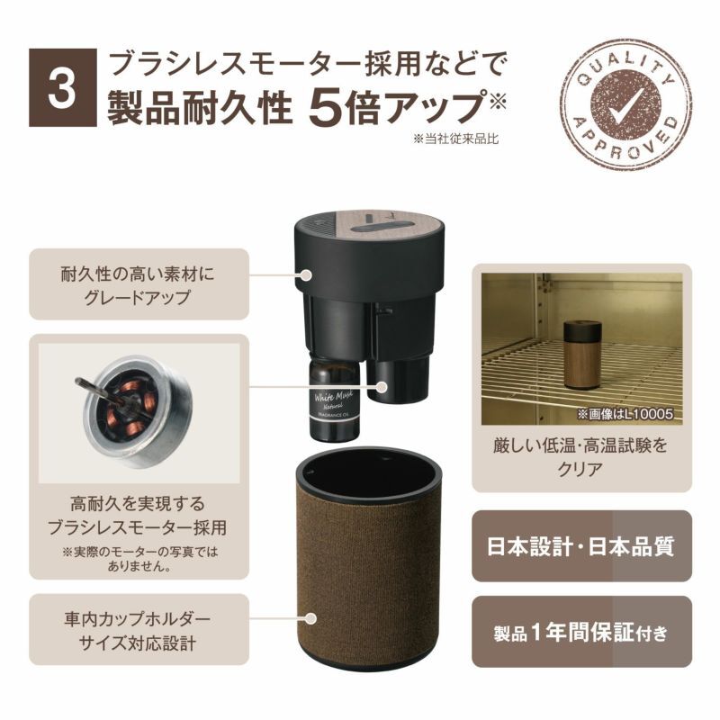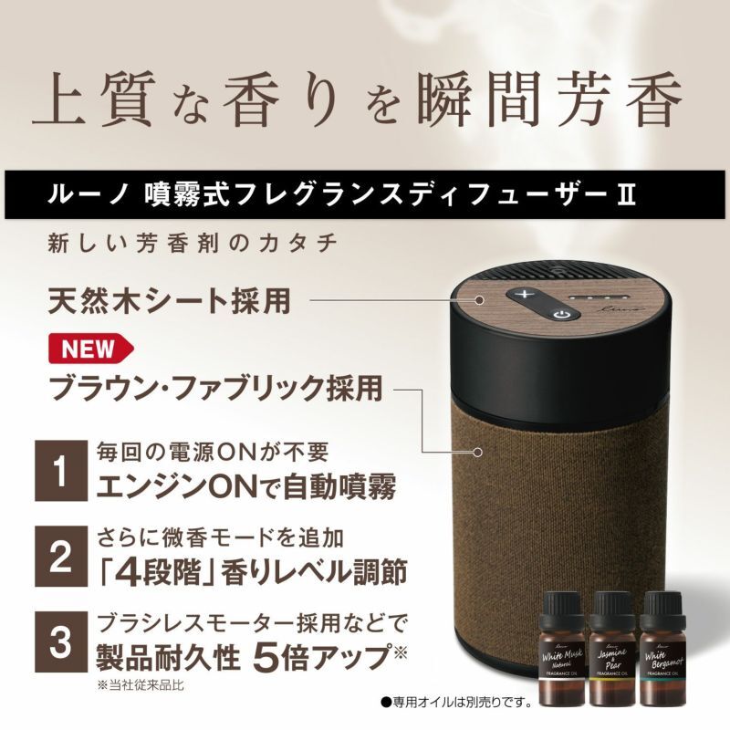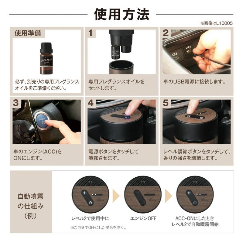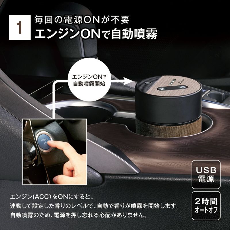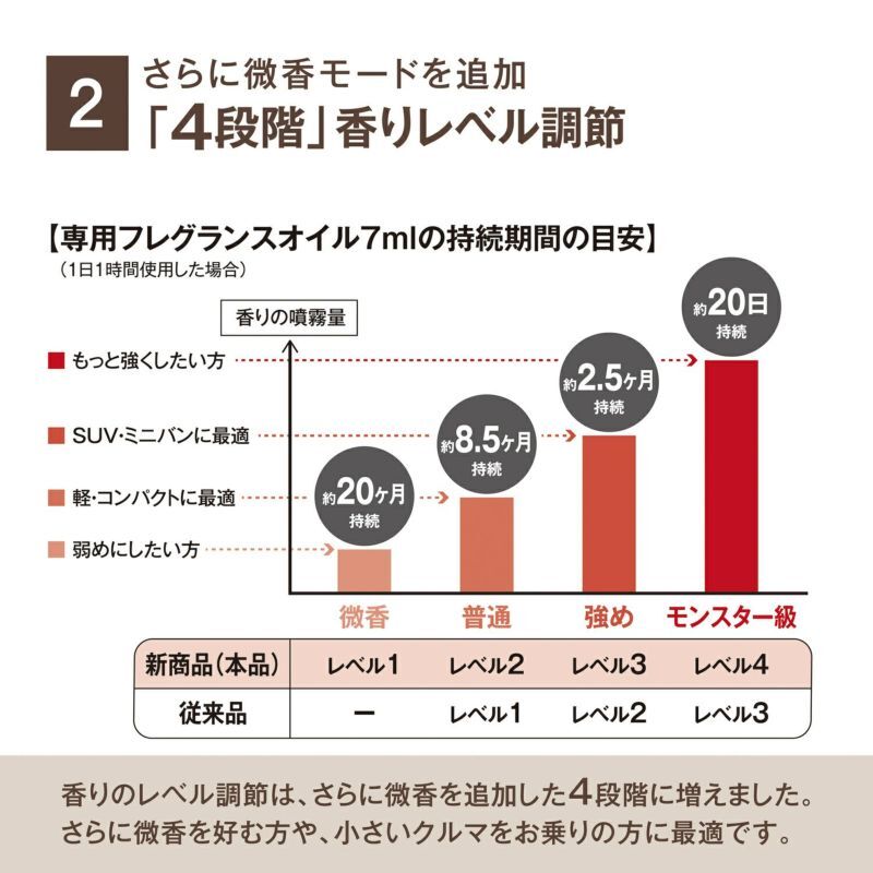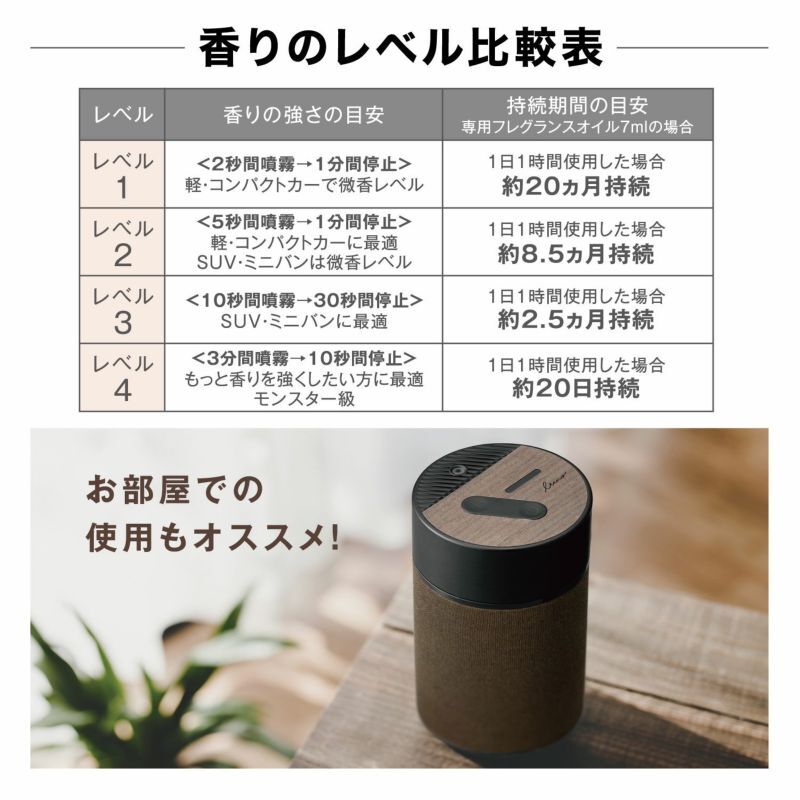 ■微香からモンスター級まで、香りをコントロールできるフレグランス ■瞬時に香り広がる 高圧噴霧ノズルで、フレグランスオイルを空気微粒子に変換し噴霧。 ■大型車も香りで充満できる芳香パワー 芳香剤を何個も使わないと香りが 楽しめなかった大型車もこれ一台で充分に香りをいきわたらせることができます。 ■4段階に香りのコントロール センサーボタン一つ操作するだけで、 微香からモンスター級まで好みの強さに調整できます。 ■エンジンONで自動噴霧 前回の設定レベルを記憶して、通電時に自動で噴霧を開始します。 ■安心設計 全てのモードで2時間オートオフ機能搭載 ■簡単ボトル交換ボトルを交換するだけ。香りチェンジもOK。 ■専用フレグランスオイルは別売りです。 (ブラング、ルーノどちらのフレグランスオイルも使用可能です) レベル2-1日1時間使用で約8.5か月使用できます。 |