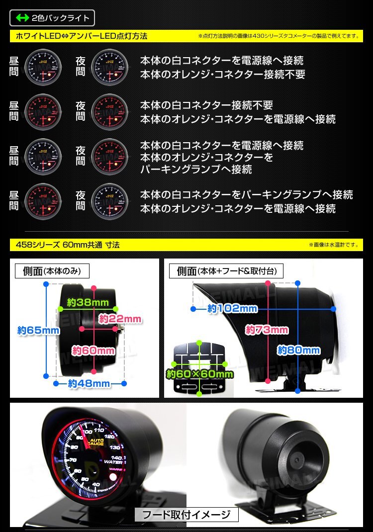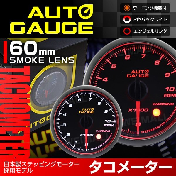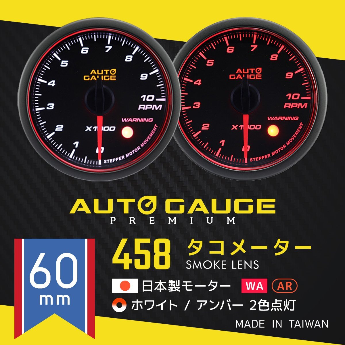 日本製ステッピングモーター搭載 オートゲージ プレミアム 458シリーズ タコメーター 60mm 点灯色: ホワイト / アンバー ワーニング機能付 エンジェルリング機能付(文字盤周囲が赤く円状に発光) |