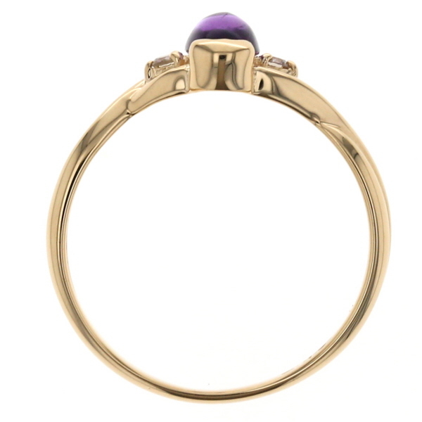 | 商品紹介 | カボションカットのアメジストを主役に、両脇にダイヤモンドをあしらったK18イエローゴールドのリングです。 艶やかに磨かれたアメジストの紫がやわらかに光を受け、アームのツイストデザインが流れるような動きを演出します。 角度によって表情を変えるカボションの瑞々しい輝きと、ダイヤの繊細な煌めきが美しく調和。 エレガントさの中に遊び心を感じさせるデザインで、指先を上品に引き立ててくれます。 |