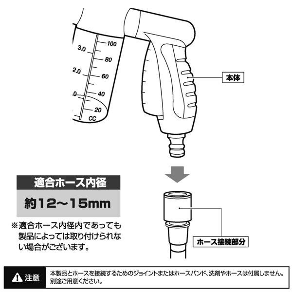 ※洗剤やホース、本製品とホースを接続するためのジョイントまたはホースバンドは付属しません。別途ご用意ください。