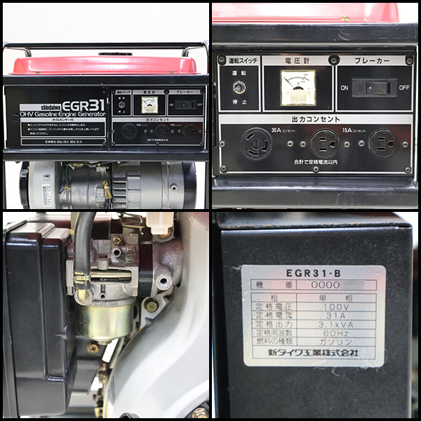 ■メーカー : shindaiwa(新ダイワ) ■型 式 : EGR31-B ■寸 法 LWH[mm] : 570×430×573 ■質 量 [kg] : 56 ■周波数 [Hz] : 60 ■定格出力 [kVA] : 3.1 ■定格電圧 [V] : 単相100 ■定格電流 [A] : 31 ■電圧調整方式 : AVR方式 ■始動方式 : リコイルスタータ式 ■機関形式 : 空冷4サイクルガソリン(OHV方式) ■排気量 [cc] : 169 ■定格出力 [kW(PS)/min-1] : 4.7(6.4)/3600 ■使用燃料油 : 無鉛ガソリン ■燃料タンク容量 [L] : 12.8 ■騒音レベル(周囲7m) [dB(A)] : 71 ■メーカー希望価格 : ¥295,000(税別) |