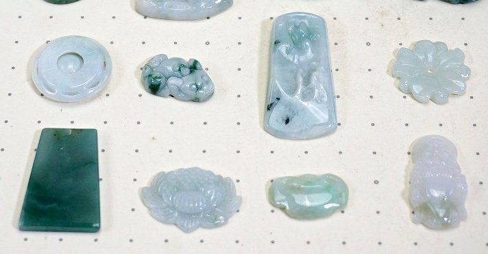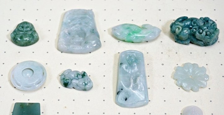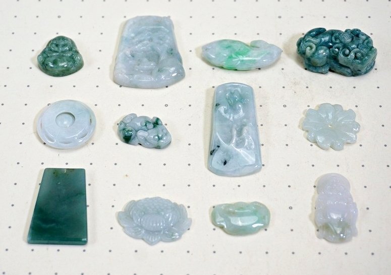 ミャンマー産 本翡翠 A貨 無着色 ペンダントトップ まとめて12点セット 本翡翠の彫刻 ペンダントトップ 12点セットです。 とても丁寧に研磨されており、艶、色味ともに非常に美しいものです。 写真がお譲りする商品の全てです。 全てミャンマー産の本翡翠になります。 材質: 本翡翠 (ジェダイト A貨 無着色) サイズ: ペンダントトップが置かれている下地の模様の点の間隔が1cmですので、参考にしてください。 原産地: ミャンマー 個数: 12点 当店の他の出品商品との同梱料は下記のとおり落札1点につき200円です。 |