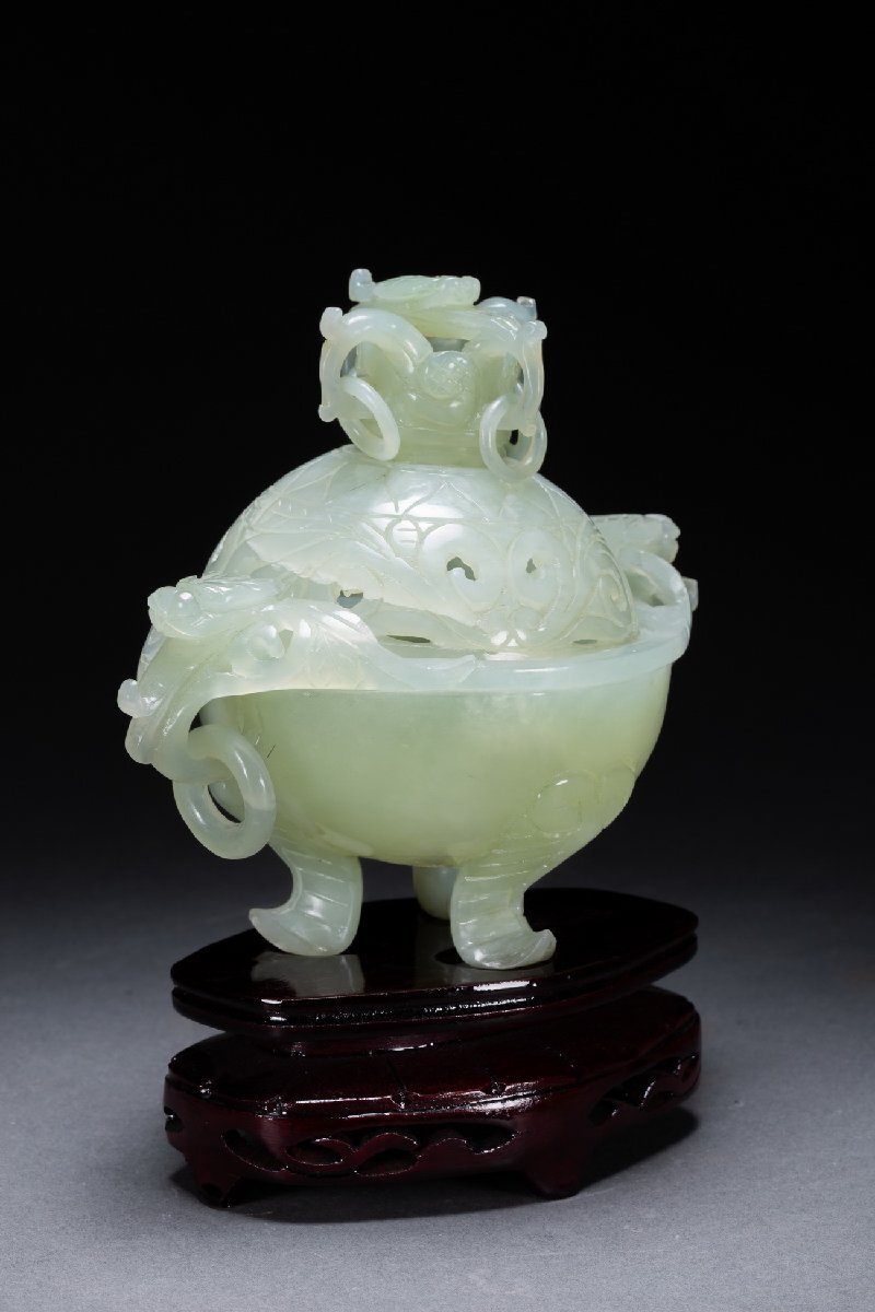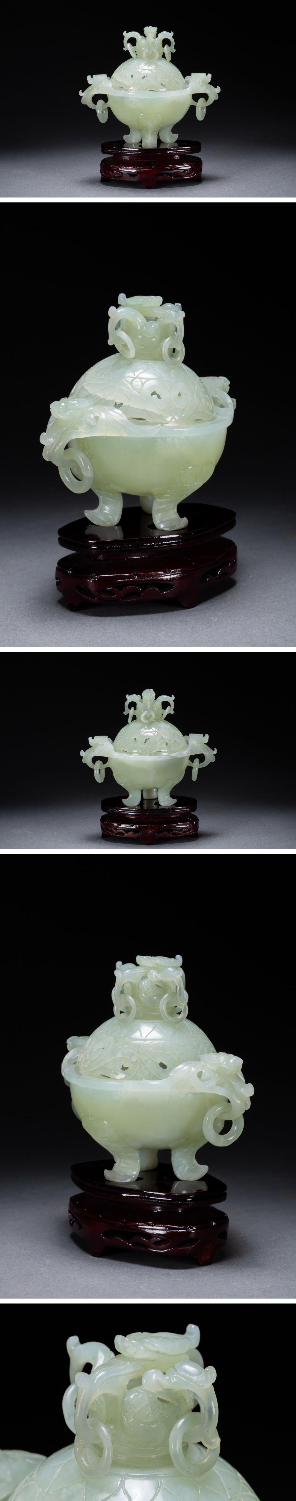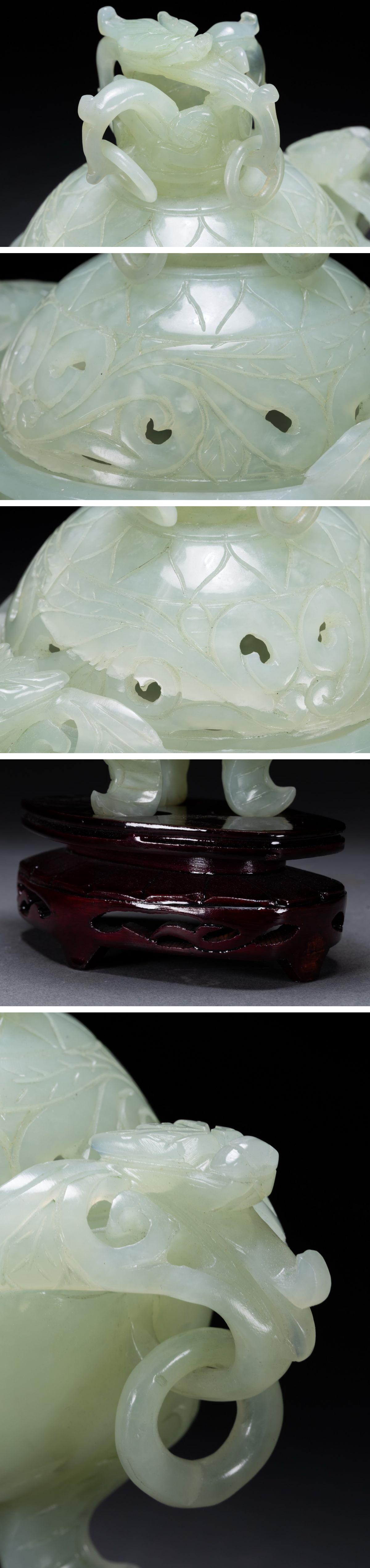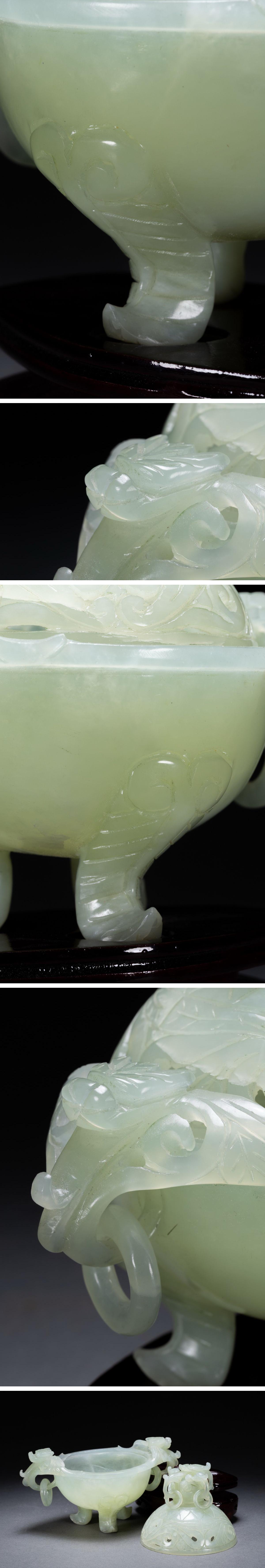 【雲錦】某有名オークション購入 時代物 天然玉石 双環耳蓋爐 台座付き 古置物 古美術 時代コレクション7L10-157S03