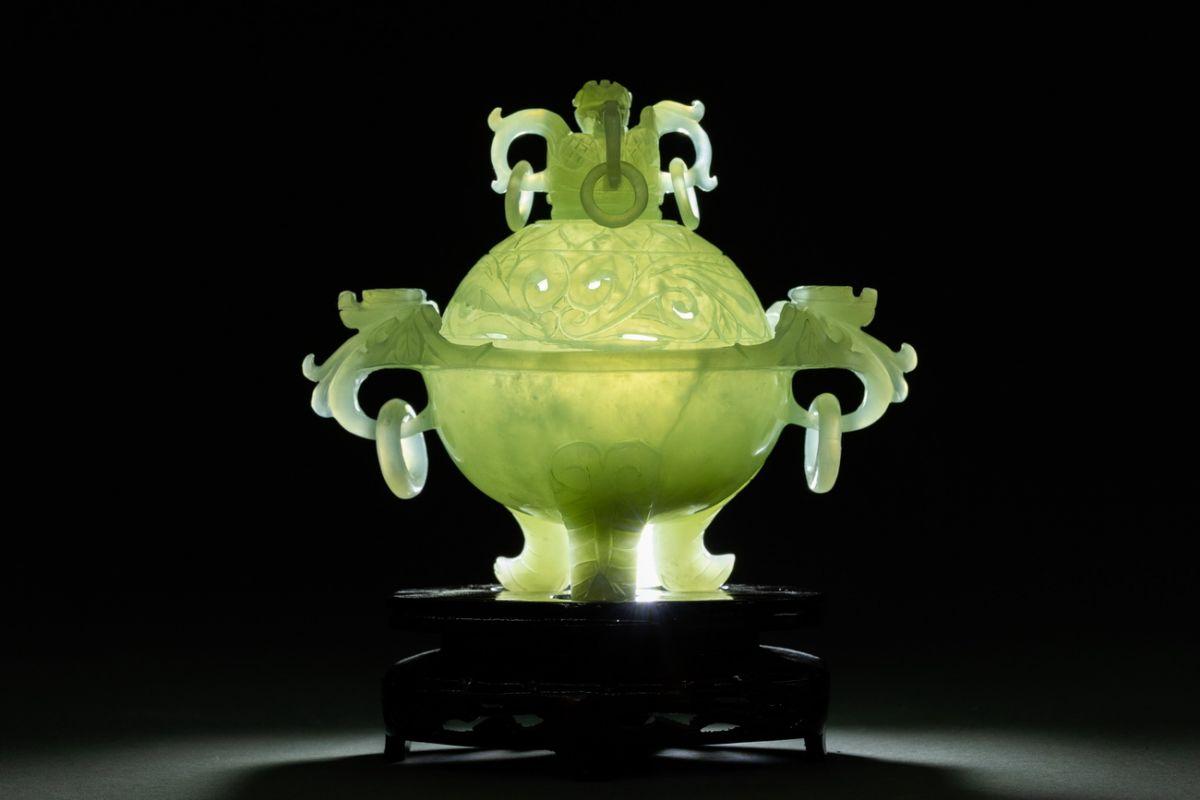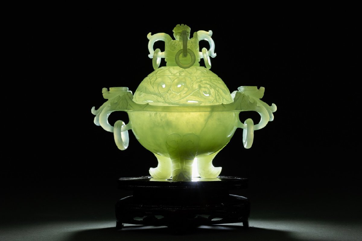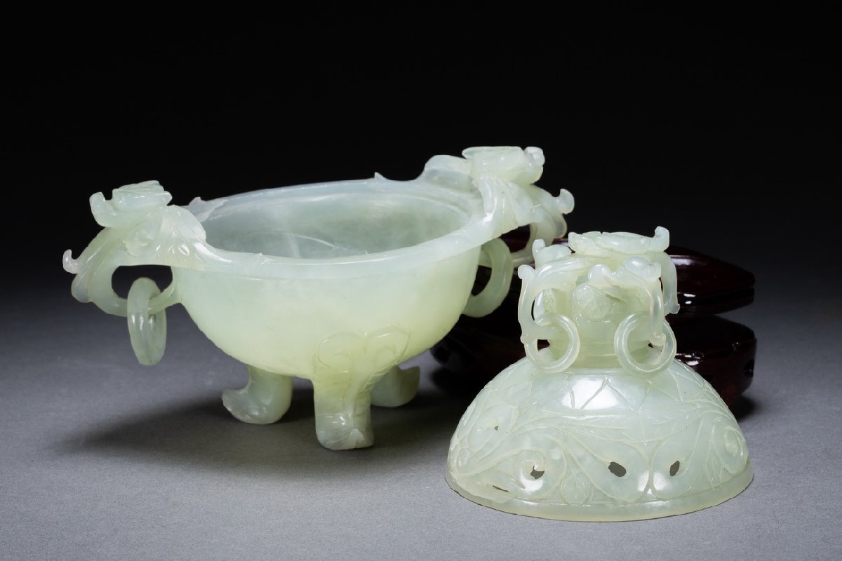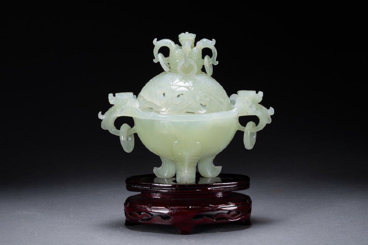 【雲錦】某有名オークション購入 時代物 天然玉石 双環耳蓋爐 台座付き 古置物 古美術 時代コレクション7L10-157S03