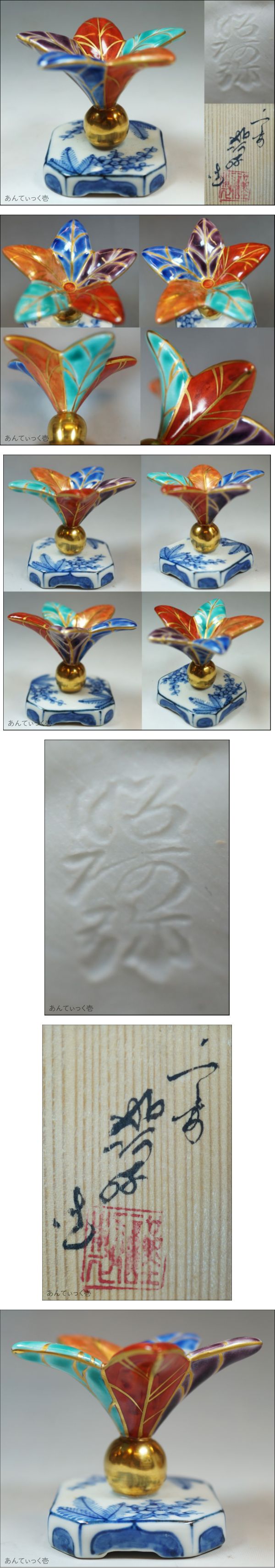 | 商品説明 | ■平安 高野昭阿弥 金彩色絵 つくばね蓋置の出品で御座います!!!■ ☆ 高さ 6.5cm 羽根幅 6.5cm 台座 4.8cm×4.8cm 重さ 86g ◆旧家/茶道の先生よりお譲り頂きました! 多少古いお品物とご理解頂いた上での入札をお願いします。 経年の擦れ/汚れ等はご了承お願いいたします。 共箱に多少の汚れが御座います。 小さな傷など全て説明しきれない場合もございますので 画像にて判断ください。 PC環境により色など実物と多少誤差が生じる場合があることを予めご了承ください。 神経質な方のご入札はお控えください。 撮影用の皿立て等は付属致しません。 (写真参照でご判断お願いいたします) ◆落札後、24時間以内にご連絡いただけない方のご入札お断りいたします。 ◆落札後 5日以内のご入金をお願いいたします。 ■支払方法 かんたん決済のみで御座います。ご了承お願い致します。 ■発送はゆうパックのみで御座います! ■領収証の発行は致しておりません! ◆商品到着後 お受け取りのご連絡を必ずお願いいたします! 商品を受け取られましたら迅速に商品受取完了の御連絡を御願い致します。 ■ 発送完了時に評価をいたしますので 不要の方は事前にお知らせください! ☆ゆうパック : 60サイズで配送いたします。 ゆうパック料金は下欄に記載いたしております。 .発送はゆうパックのみで御座います。 【【【重要】】】 ★【真作】 真作であると保証できる作品を 真作と表記いたします!!! リトグラフ/木版画などの版画作品なども対象となります。 ★【模写】 真贋の判断が出来ない場合 模写と表記致します! ☆保証期間内に商品が真作でないと判断された場合は 落札金額/送料/鑑定代金等をご返金いたします。 ☆返金請求をされる場合 その証明として下記の書類等が必要となります。 ※贋作と証明された該当商品 ※所定鑑定機関または公式鑑定人が発行した書類(原本必須/コピー不可) 公的鑑定機関発行の鑑定(証明)書 作家自身の署名捺印のある書面 等 ■ 評価が5以下の方 新規ご入札の方は質問欄で購入のご意思をご連絡お願い致します! (ご連絡なき時は削除させて頂く場合もございます。) ■ 画像でのご判断いただきご納得いただける方のみ入札ご参加願います。 ◆ 梱包材一部・新聞紙等をリサイクル使用しますので ご了承お願いいたします。 ◆ 開封後に商品に問題が御座いましたら 評価を頂く前にご連絡お願いいたします。 最善の解決努力をいたします。 ■ヤフーオークション新規の方は基本的にお断りいたしておりますがご 希望の方は質問欄でご意思をお伝えください!!!! ■ 当方千葉県市川市で骨董/アンティーク店経営いたしております。 お近くの方は店頭でご覧下さい。 また店頭でのお渡しも可能ですのでご相談ください。 他にも多数出品しております。 : 自己採寸ですので多少の誤差はご了承ください。 : 神経質な方評価の悪いが多い方のご入札ご遠慮ください。 :詳細は質問でお願いいたします。 :写真をよくご覧になってご入札をお願い致します。 :店舗でも販売いたしておりますので入札後に出品取り消し させて頂く場合もございます。ご了承お願いいたします。 注意事項 ・ご落札後、24時間以内にご連絡いただけない方のご入札お断りいたします。 ・5日以内のご入金をお願いいたします。 ・マイナス評価、キャンセル歴の多い方はご入札を取り消させて 頂く場合もありますのでご了承願います。 ・店頭でも販売致しておりますので売り切れ等で入札があっても 取り消す場合がございます。 ・同梱発送に付きましては混乱等を回避する為、同日の落札分のみとなっております。 ・ご不明な点等ございましたら、入札前に質問欄より、お問合せ下さい。 (終了直前、時間外等々でご質問の対応が出来ない場合が御座います) 千葉県市川市市川2-6-14 TEL: 047-325-1603 |