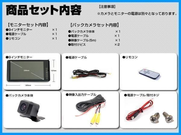 | ■液晶モニター + バックカメラセット 液晶モニターとバックカメラのセットなので、こちらのセットだけでバックカメラをご利用出来ます。 ■9インチミラー液晶モニター 9インチの大型液晶なので、バックカメラ用としては、満足出来る大きさです。 また、2系統の入力端子を装備しているので、DVDプレーヤー等も別途接続出来ます。 |