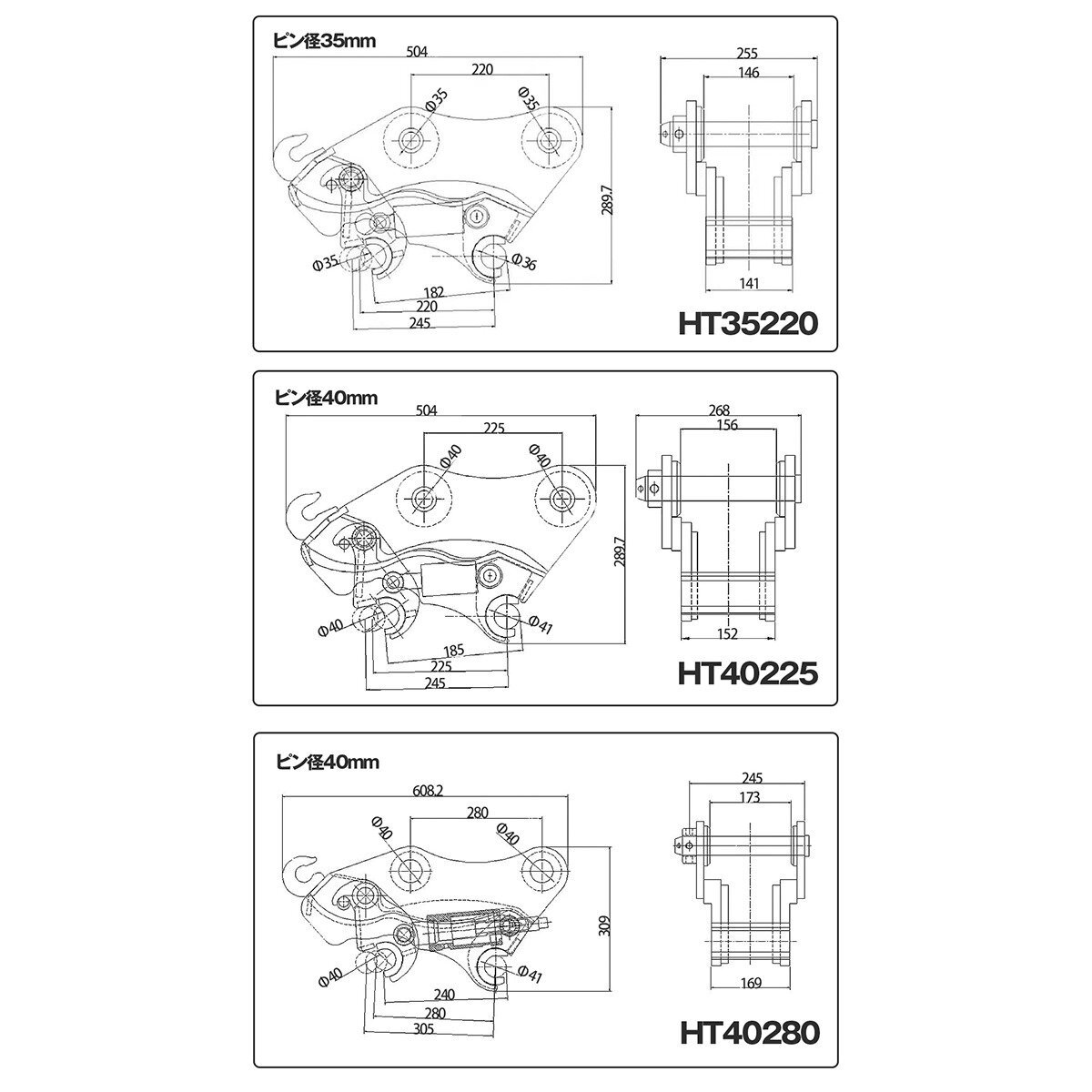 ヒッチピン径:35mm アーム幅:146mm ピン取付幅:220mm 取付許容範囲:182-245mm サイズ:504×255×290mm 重量:42kg 適合ユンボ:2-3t |