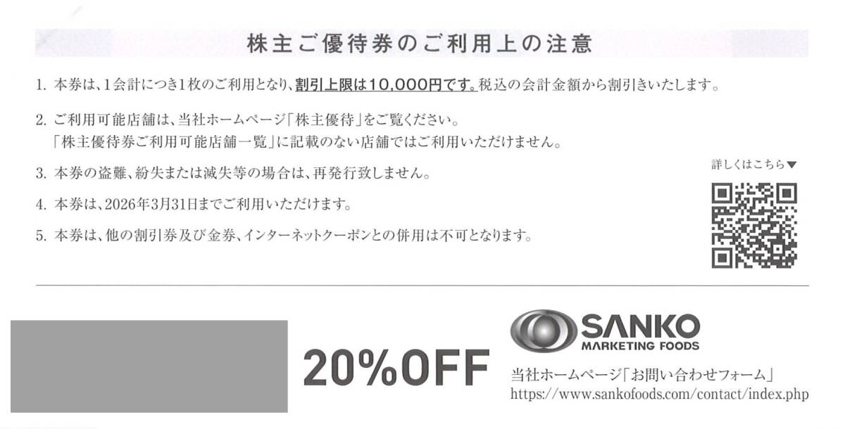 有効期限は「2026年3月31日」です。 本券は、1会計につき1枚のご利用となり、割引上限は10000円です。税込の会計金額から割引きとなります。 ※詳細につきましては、画像やホームページの株主優待をご覧ください。 |