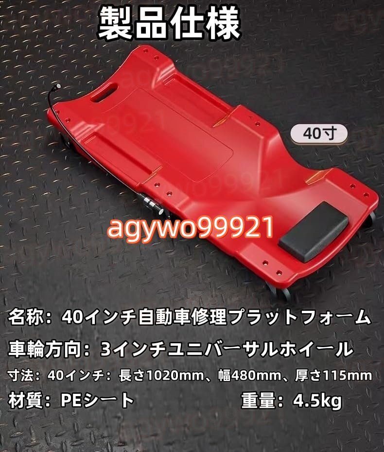 商品の説明 40インチの車修理用寝台ボードで耐荷重200KGの頑丈な設計 デュアルツールトレイとマグネット式ツールボックスで工具整理が簡単 名称:40インチ自動車修理プラットフオ一ム 車輪方向:3インチコニバ一サルホイ一ル寸法:40インチ:長定1020mm、幅480mm、厚115mm材質:PEシ-ト 重量:4.5kg