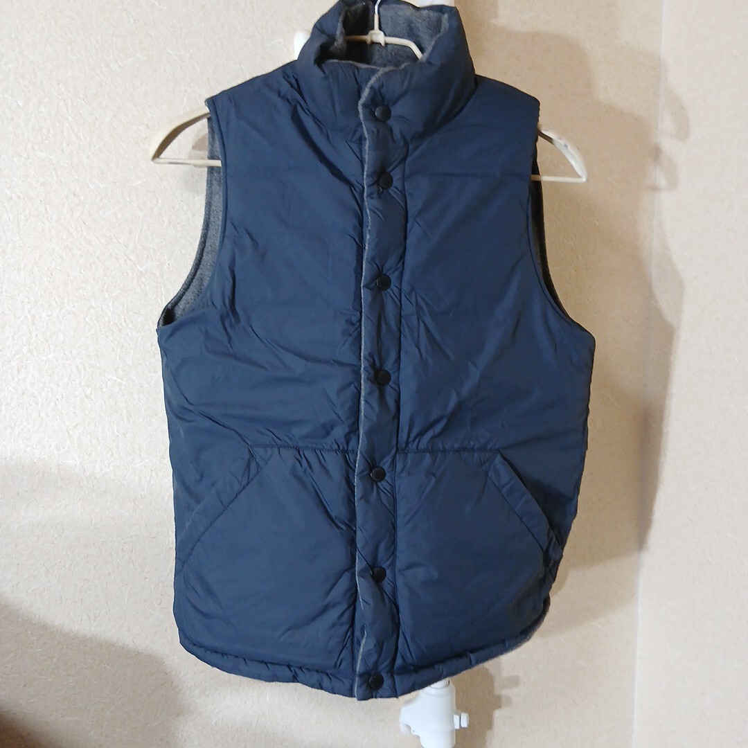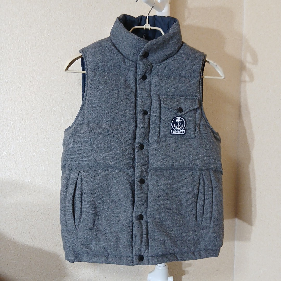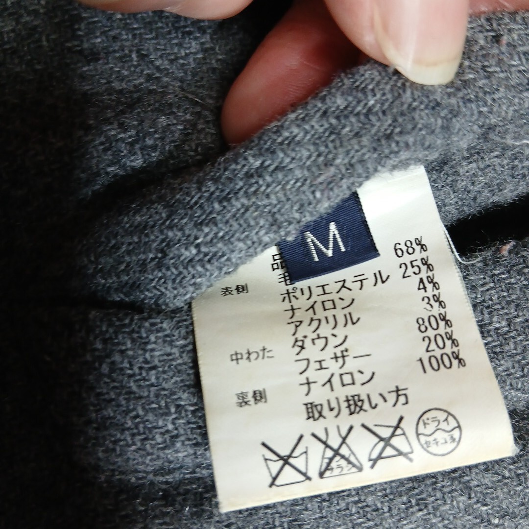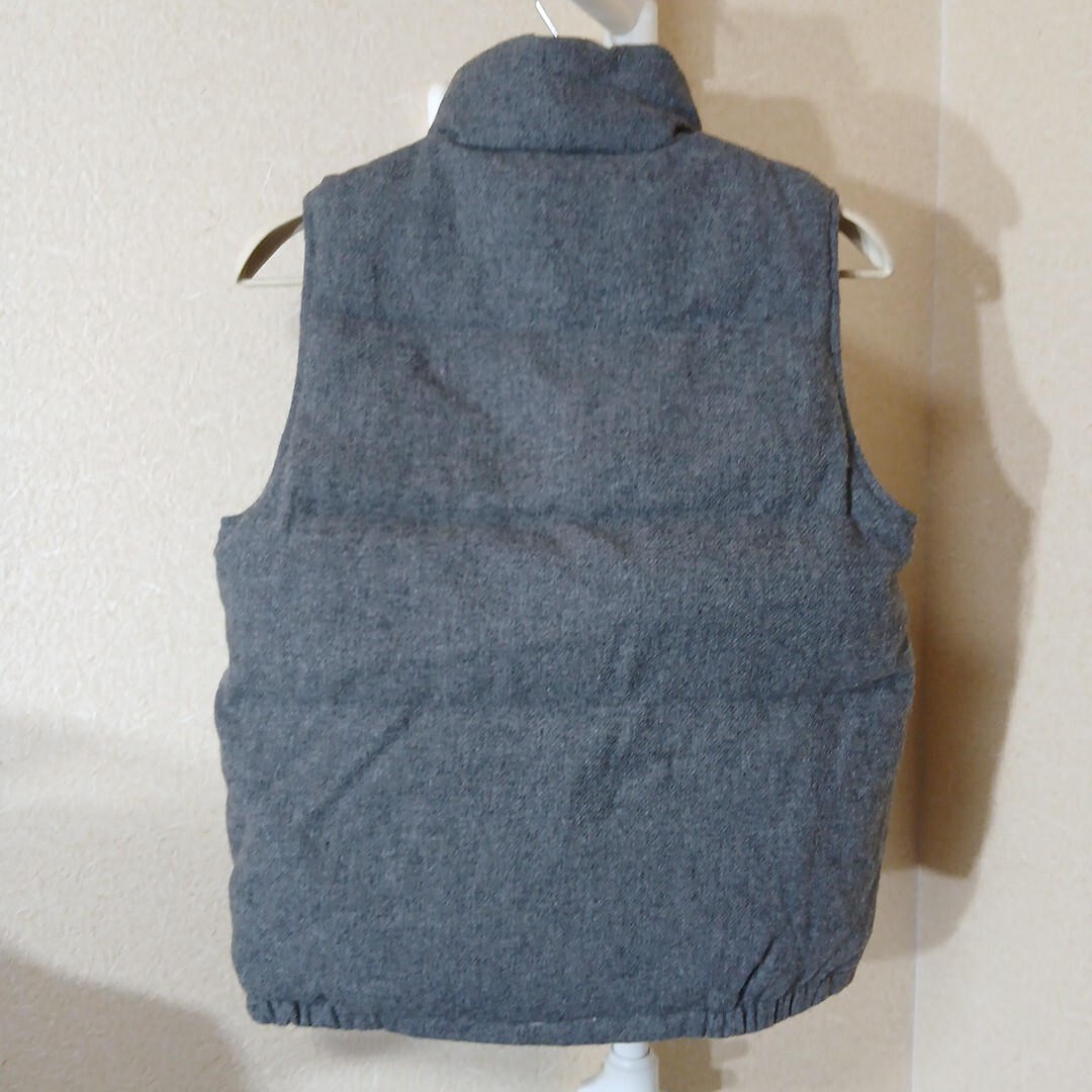 フィデリティー(アイメックス)のダウンベストです。サイズはMで、実寸でおおよそ肩幅35センチ、身幅48センチ、着丈60センチです。素材は、表地が毛68%、ポリエステル25%、ナイロン4%、アクリル3%で、中綿がダウン80%、フェザー20%で、裏地がナイロン100%です。色は、グレーと紺色です。多少使用感などございますが特に目立つキズや汚れは無いと思います。