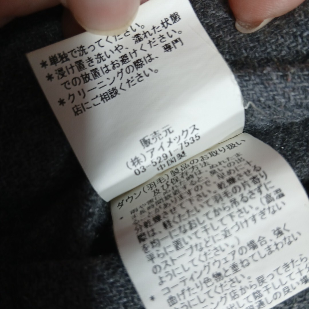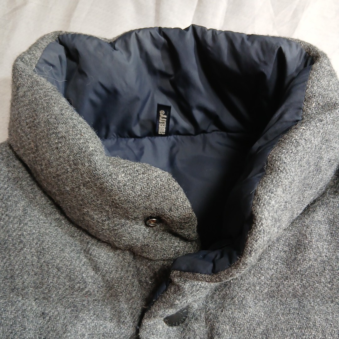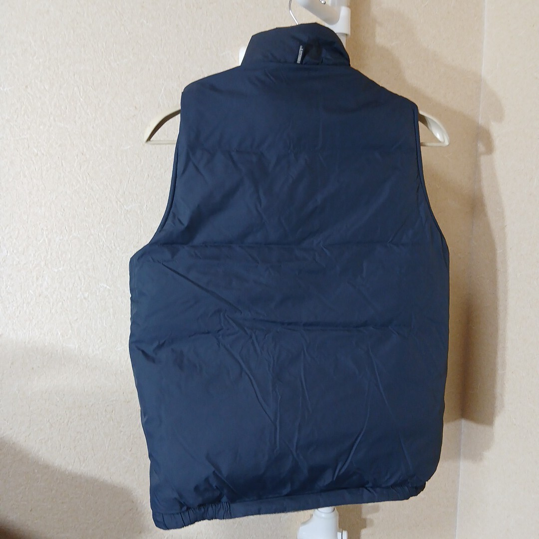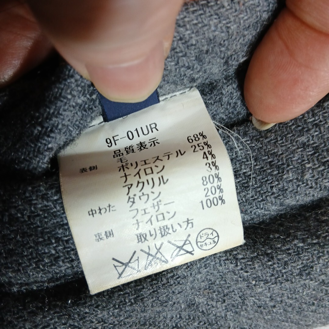 フィデリティー(アイメックス)のダウンベストです。サイズはMで、実寸でおおよそ肩幅35センチ、身幅48センチ、着丈60センチです。素材は、表地が毛68%、ポリエステル25%、ナイロン4%、アクリル3%で、中綿がダウン80%、フェザー20%で、裏地がナイロン100%です。色は、グレーと紺色です。多少使用感などございますが特に目立つキズや汚れは無いと思います。