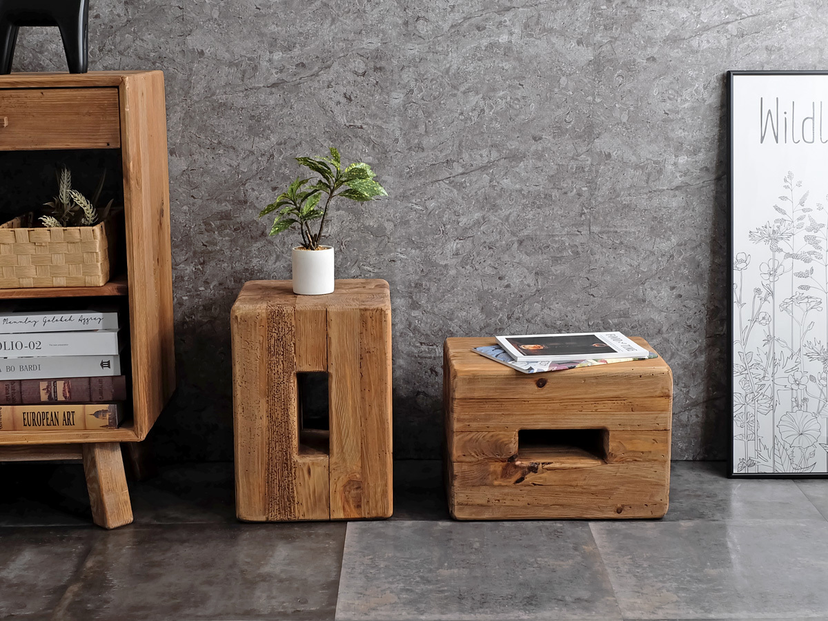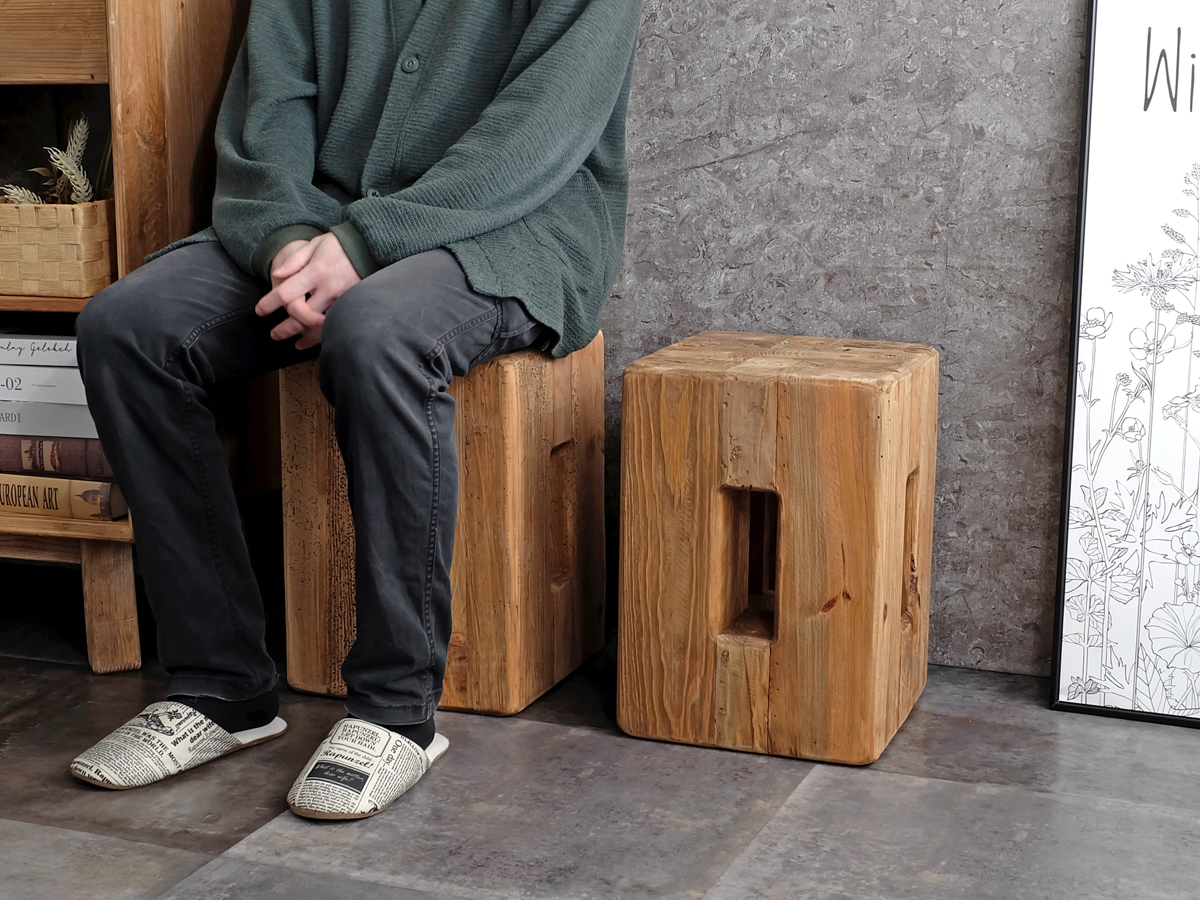 | 商品説明 | 素材を活かしたヴィンテージな風合いの味わい深いスツール。 元は建物等に使用されていたパイン古材を再利用して造られており、経年変化による傷や凹み等、一点毎に異なる表情はまさに唯一無二。 切り出したばかりの新材には出せない歴史や風情は、古材ならではの魅力です。 そんなラフな質感や手触りが好きな方には堪らない、個性あふれるリサイクルウッドに愛着を感じるアイテムに仕上がっています。 木材をそのまま切り出したようなラフなデザインが印象的なスツールで、縦横どちらにも使えますので、スツールとしてだけでなく、エントランスでベンチとしてや、ソファ横でサイドテーブルとして、他にもリビングなどでディスプレイスタンドとして使用するのもオススメです。 古材を贅沢に使用した重厚感のあるフォルムなので、そのままお部屋に置くだけでも様になりますね。 |