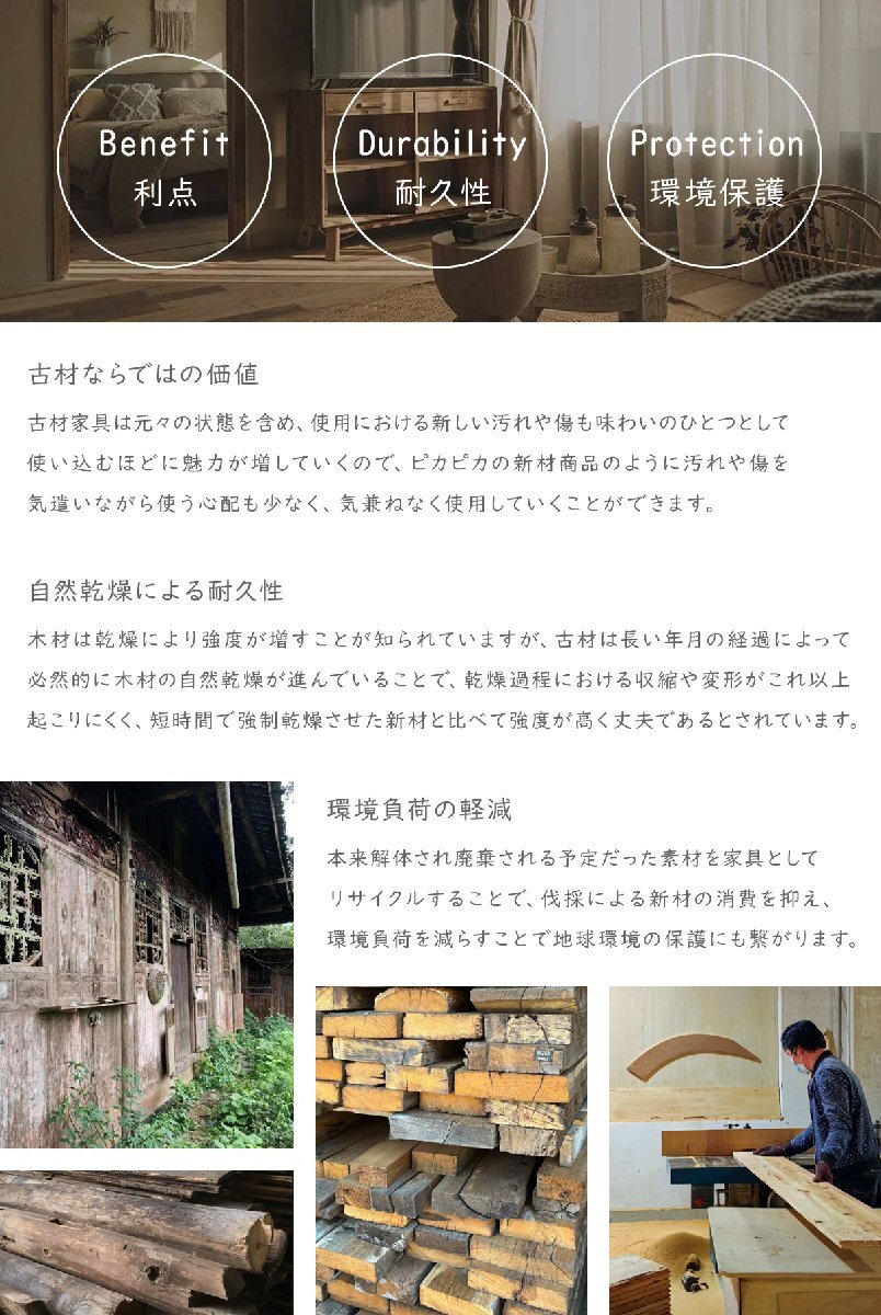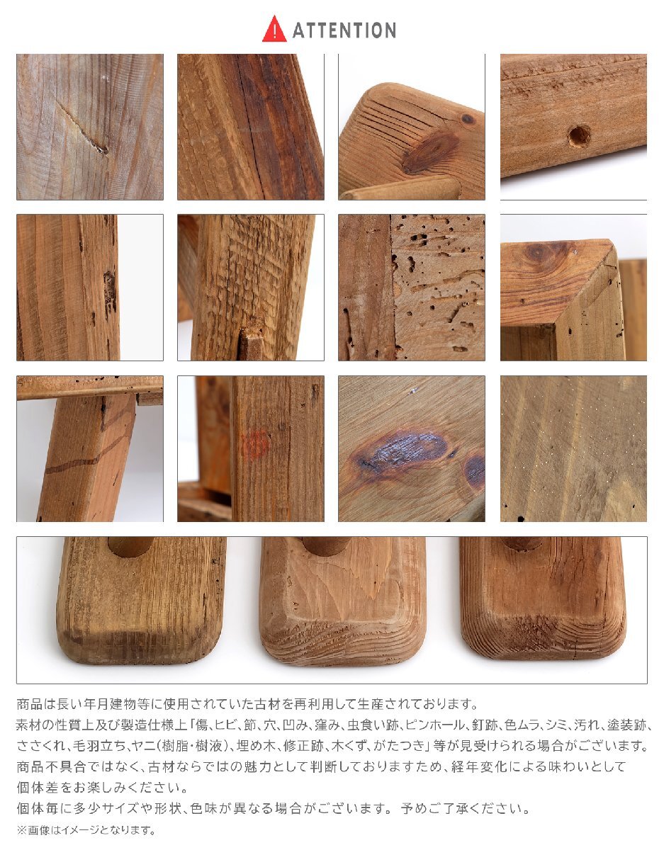 | 注意事項 | * 商品はスツールのみとなります。小物類等は付属しません。 * 商品は長い年月建物等に使用されていた古材を再利用して生産されており、古材のナチュラル感を存分に活かすため あえて特別な加工を行わないことで、古材自体の魅力をより楽しめるよう1点1点個体差が生まれています。 * 素材の性質上及び製造仕様上「傷、ヒビ、節、穴、凹み、窪み、虫食い跡、ピンホール、釘跡、色ムラ、シミ、汚れ、塗装跡、 ささくれ、毛羽立ち、ヤニ(樹脂・樹液)、埋め木、修正跡、木くず、がたつき」等が見受けられる場合がございますが、 そのラフさも含めて古材ならではの魅力として判断しておりますため、経年変化による味わいとして個体差をお楽しみください。 * 素材由来の内容に関しましては製品不良とは判断致しかねますので予めご了承下さい。 * 個々で木目、色味などが異なります。また、多少サイズや形状、仕上がりなどが異なる場合がございます。 * 踏み台として利用する等、製品の一部に過度な荷重をかけないで下さい。 * 天板に物を乗せたまま移動しないで下さい。また、加熱した鍋など、高温のものを直接置かないで下さい。 * 湿気の多い場所、傾斜のある場所、直接日光のあたる場所、火気、ストーブなどの近くへの設置は避けて下さい。 * ウッドフロアーや畳などの上に製品を設置する場合、床面に傷がつかないようにカーペットなどを敷いてください。 * ご使用のモニター画面により、掲載画像と実際の商品の色味が異なる場合がございます。 * 製品の仕様は予告なく変更になる場合がございます。 * 北海道は別途「1,000円(税抜)×個数分」の送料が必要となります。 * 沖縄・離島は配送不可となります。 |