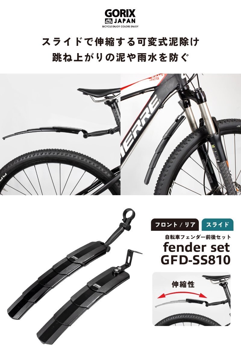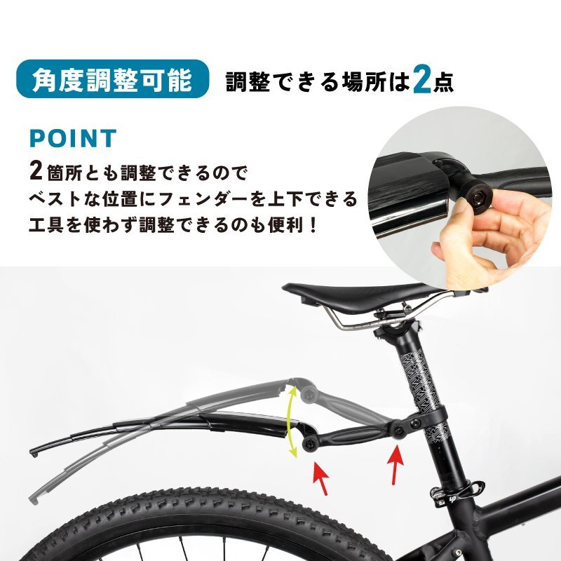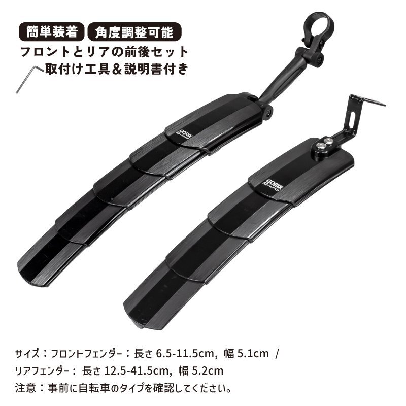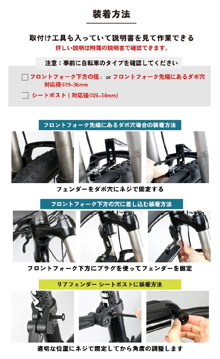 雨などの悪天候や路面がウェットの時に前輪や後輪から跳ね上げられる泥、雨水をお尻や背中にかかるのを防ぐアイテムです。 この泥除けフェンダーセットはフロント、リアともにスライドで伸縮可能な可変式となっているのが特徴です。 必要によって伸ばしたり縮めたりできる。 またリアフェンダーは工具を使わず上下に角度調整ができるので柔軟にポジションをだしやすい。 制服やスーツでの自転車通勤や自転車通学には是非装着したい泥除けです。 衣服やリュックを汚さず雨上がりでも安心して乗れるようになりますね。 梅雨の季節で最も活躍するフェンダー。 幅広いのでタイヤの太いMTBマウンテンバイクに最適な自転車用泥よけです。 [伸縮スライド式] 自転車の形状やサイズ、必要により長さを調節可能な伸縮性が特徴の泥よけです。 スライドで伸縮するのでとても簡単。 使わない時はコンパクトにできるので保管場所もとらない。 [角度調節可能] リアフェンダーは角度調整が可能で上下に調整できます。 2カ所で調整できるので自転車にとってベストな位置を導けます。 【工具を使わず調整できる】 [耐久性] 柔軟性の持つ高強度PA素材で曲げや折れに強く壊れにくい。 頑丈で耐久性あり。 [前後セット] フロントフェンダーとリアフェンダーがセットに。 リアフェンダーはシートポストに取付けるだけで簡単に装着できる。 商品内容フェンダー前後セット、日本語説明書、工具 サイズフロントフェンダー:長さ6.5-11.5cm, 幅5.1cm / リアフェンダー: 長さ12.5-41.5cm, 幅5.2cm 取付け方法(フロント)フロントフォーク先端にあるダボ穴もしくはフロントフォーク下方の径(対応径Φ19-36mm)/ (リア)シートポスト (対応径Φ26-34mm) 注意事前に自転車のタイプを確認してください。 |