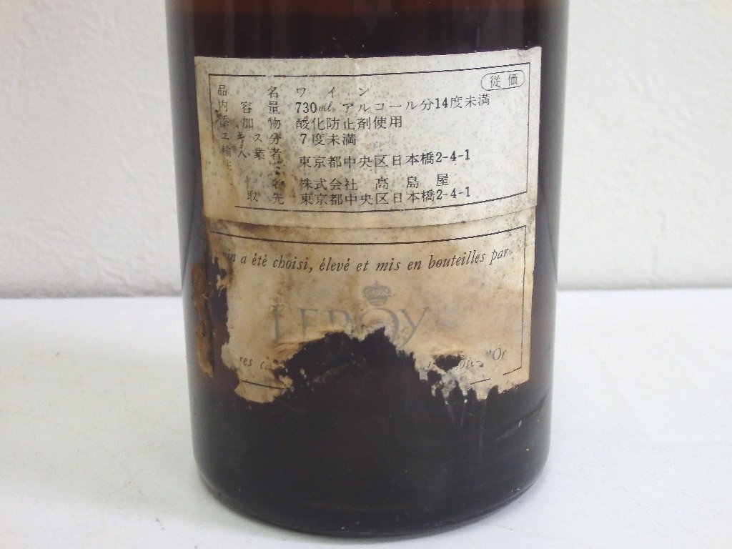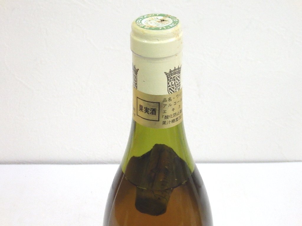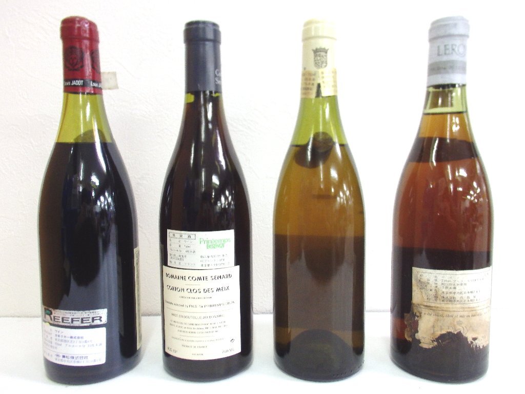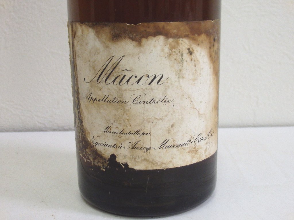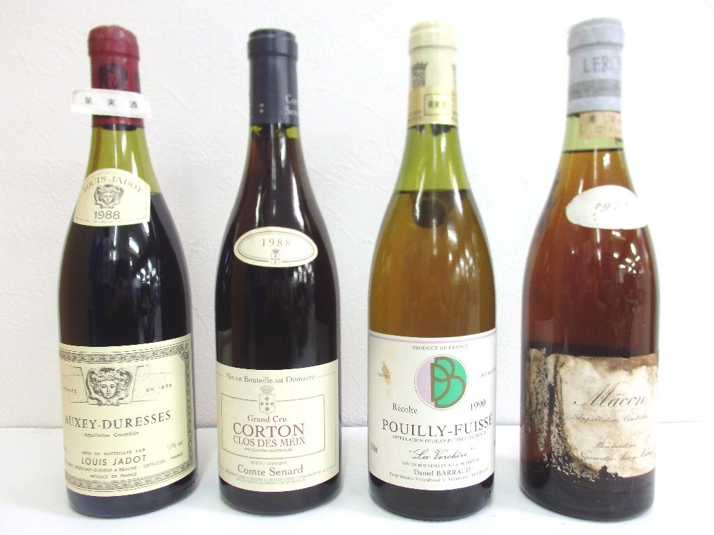 | 内容 | ・ルイジャド オークセイデュレス 1988 750ml 15%未満/ラベル一部劣化と接着剥がれかけ/液面低下/澱多あり/キャップフィルムダメージと汚れ ・コント スナール コルトン グランクリュ クロ デ メイ 1988 750ml 14%未満/ラベル少し汚れ/コルク落ち/澱多あり ・プイィ フュイッセ 1990 750ml 13%/ラベル汚れ/ボトル表面一部小傷/液面低下/澱多あり/コルク落ち/キャップフィルム少し劣化と汚れ/漏れ跡あり ・ルロワ マコン 1978 730ml 14%未満/ラベルダメージ大/ラベル汚れ/ラベル印字一部消え/ボトル表面汚れと一部小傷/液面低下/澱多あり/キャップフィルムダメージと汚れ/漏れ跡あり |