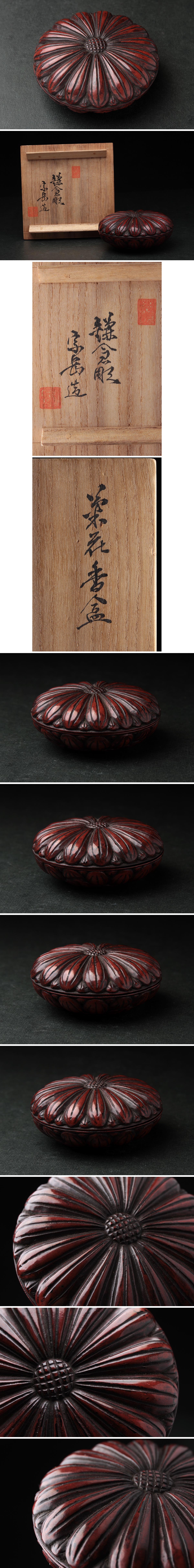 | ◆ 時代漆工芸【寸松堂 佐藤宗岳 造】鎌倉彫 菊花香合 径6.8cm 共箱附・根来菊彫文香合・蓋物 伝統工芸 漆器 古美術 ◆