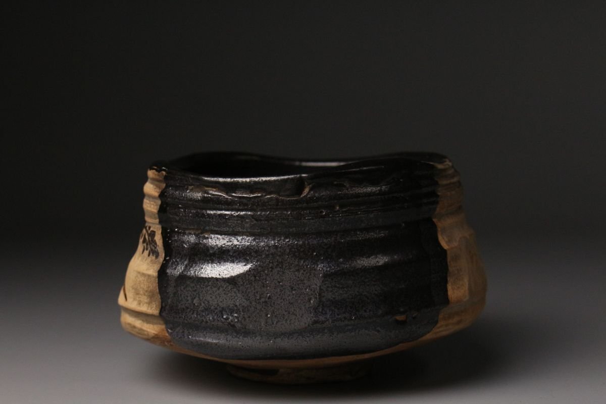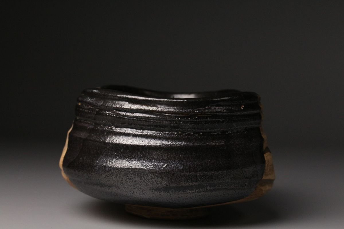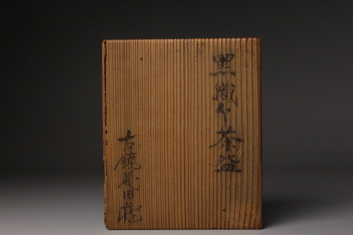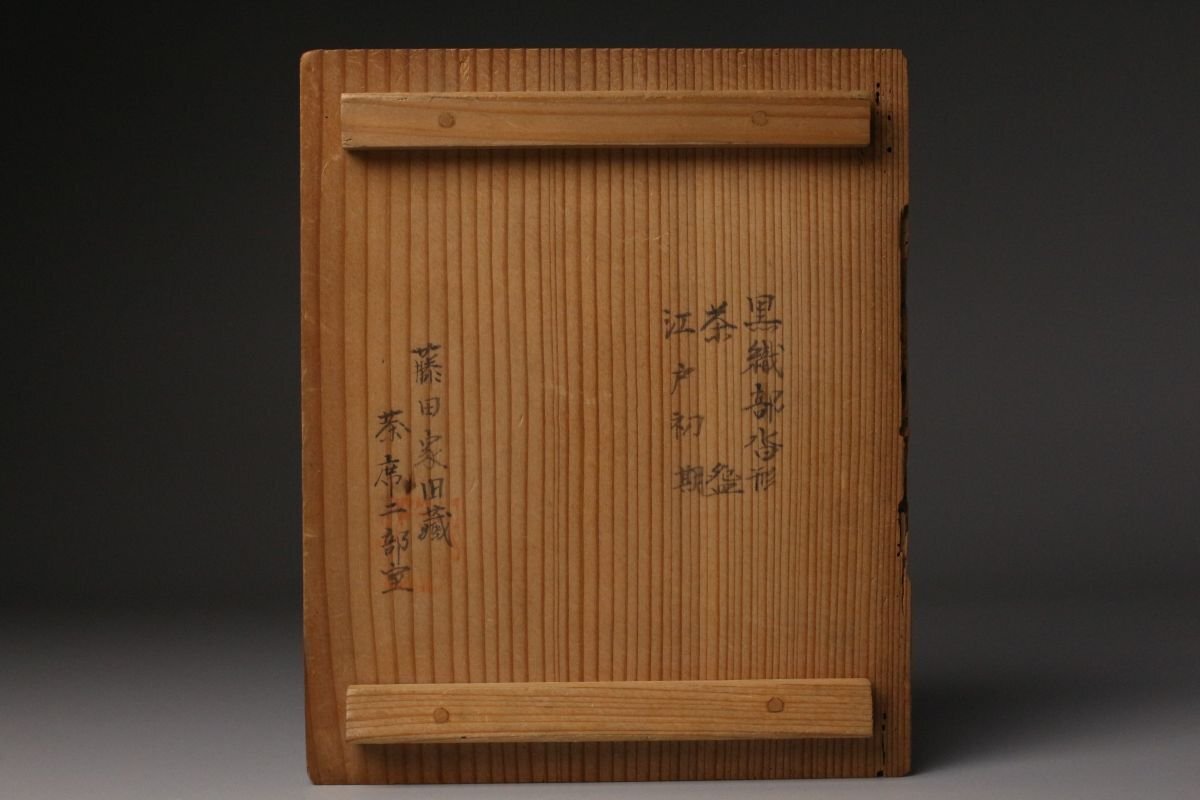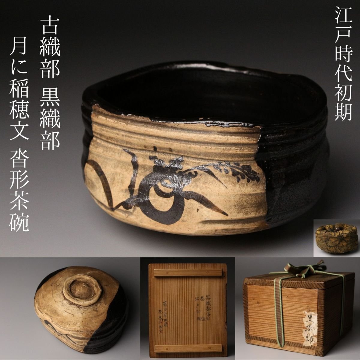[.QT]25.11 25110917A* * * 商品詳細 * * * ここでしか出逢うことのできない唯一の美をご紹介させて頂きます。 江戸初期の気韻を映す、古織部・黒織部〈月に稲穂文 沓形茶碗〉。 沓形の柔らかな歪みと、黒釉の奥に沈む深い光。 そこに描かれた「月に稲穂」の文様は、 静かな秋夜の趣きをそのまま一碗に閉じ込めたような落ち着いた風情を漂わせています。 稲穂の鉄絵は素朴でありながら力強く、 黒釉との対比によってより鮮やかに浮かび上がり、 古織部らしい伸びやかな絵心を堪能できます。 沓形の造形にも自然な動きがあり、手に取るとしっとりと馴染み、 茶席に個性と格調を添える存在感を持っています。 付属の墨書箱には、蓋裏に「藤田家旧蔵」と記されており、 名家に伝来した由緒ある茶碗であることがうかがえます。 さらに仕覆も残され、長く丁寧に伝えられてきた品であることが感じられます。 織部の美、黒釉の深み、秋の情景、そして確かな伝来。 四つの魅力が調和した、茶席に映える逸品です。 ■商品内容/ 茶碗、仕服、旧家収蔵箱 ■サイズ/横14㎝×高7.5㎝×奥行11㎝ 箱:横15㎝×高12㎝×奥行18㎝ ■状態/ スレ、少傷、汚れ、箱にスレ、傷、汚れ、経年による痛み、仕服に破れ、ほつれがございます。 ※写真にてご確認、ご了承の上ご入札下さい。
