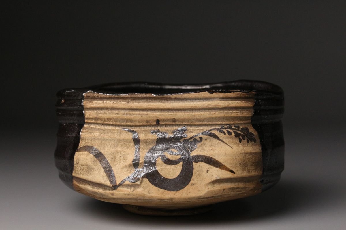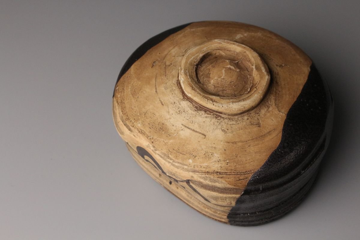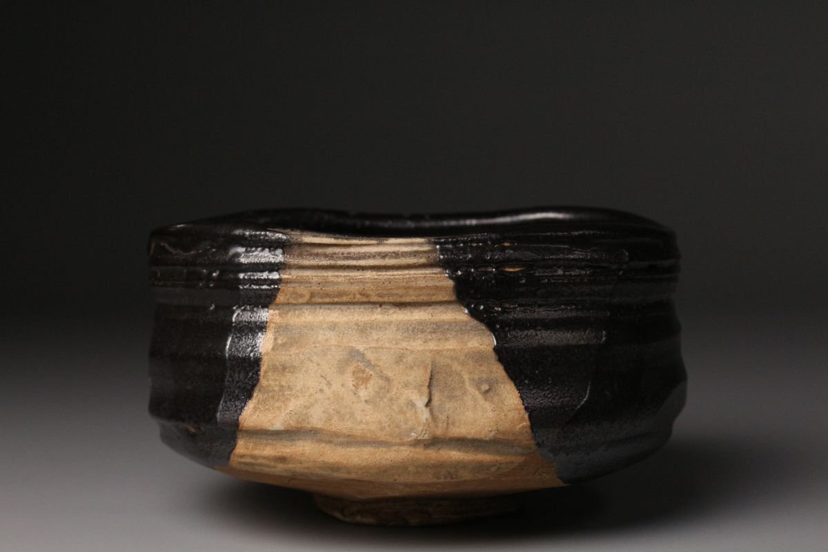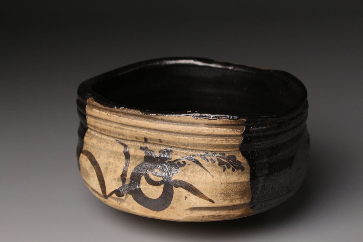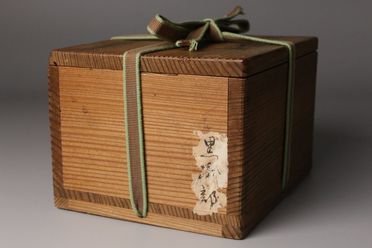 [.QT]25.11 25110917A* * * 商品詳細 * * * ここでしか出逢うことのできない唯一の美をご紹介させて頂きます。 江戸初期の気韻を映す、古織部・黒織部〈月に稲穂文 沓形茶碗〉。 沓形の柔らかな歪みと、黒釉の奥に沈む深い光。 そこに描かれた「月に稲穂」の文様は、 静かな秋夜の趣きをそのまま一碗に閉じ込めたような落ち着いた風情を漂わせています。 稲穂の鉄絵は素朴でありながら力強く、 黒釉との対比によってより鮮やかに浮かび上がり、 古織部らしい伸びやかな絵心を堪能できます。 沓形の造形にも自然な動きがあり、手に取るとしっとりと馴染み、 茶席に個性と格調を添える存在感を持っています。 付属の墨書箱には、蓋裏に「藤田家旧蔵」と記されており、 名家に伝来した由緒ある茶碗であることがうかがえます。 さらに仕覆も残され、長く丁寧に伝えられてきた品であることが感じられます。 織部の美、黒釉の深み、秋の情景、そして確かな伝来。 四つの魅力が調和した、茶席に映える逸品です。 ■商品内容/ 茶碗、仕服、旧家収蔵箱 ■サイズ/横14㎝×高7.5㎝×奥行11㎝ 箱:横15㎝×高12㎝×奥行18㎝ ■状態/ スレ、少傷、汚れ、箱にスレ、傷、汚れ、経年による痛み、仕服に破れ、ほつれがございます。 ※写真にてご確認、ご了承の上ご入札下さい。