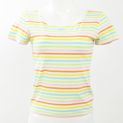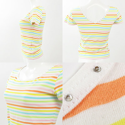 | 優しい色のマルチボーダーが可愛い☆Tシャツ 大きめに開いたネックラインと、バックの開きで ヘルシー&セクシーな着こなしに。 きらりと光るラインストーンがネックラインにぐるりと 一周付いていて、前後リバーシブルでも着られますよ♪ パンツ、スカート共に相性の良い短め丈です。 全体にうっすらと毛羽立ちがございます。 実寸 着丈(後ろVネックより裾まで)約36cm 肩幅約38cm 袖丈約14cm バスト約80cm 【サイズ】:(2) 【素 材】:(綿92% ポリウレタン8%) 【 色 】:(白・ピンク・オレンジ・黄・水色・薄緑) 【程 度】:(AB) 管理番号 27140522-016 355 027 | ||||