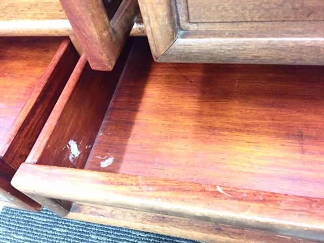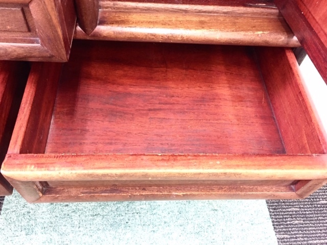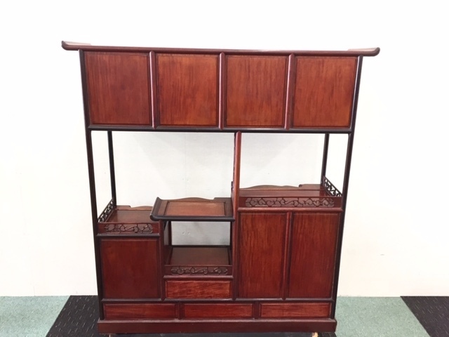 商品説明 引き出しや段違い棚で収納やものを飾ることが出来ます 最下段引き出しサイズ:奥行26.6cm、横31.2cm、高さ7cm 表示されている送料は目安の金額です。 決済後に送料が修正される場合もございますのでご了承ください。 ※ご不明な場合は決済前にお問い合わせ下さい。 詳細 ●サイズ:縦36cm、横122.5cm、高さ131cm ●素 材:木製 ●ランク:ヴィンテージランク ●コンディション:中段中央の引き出しが固く、開きにくいです 引き出しや唐木彫刻部分など全体的に傷、汚れが多々あります |