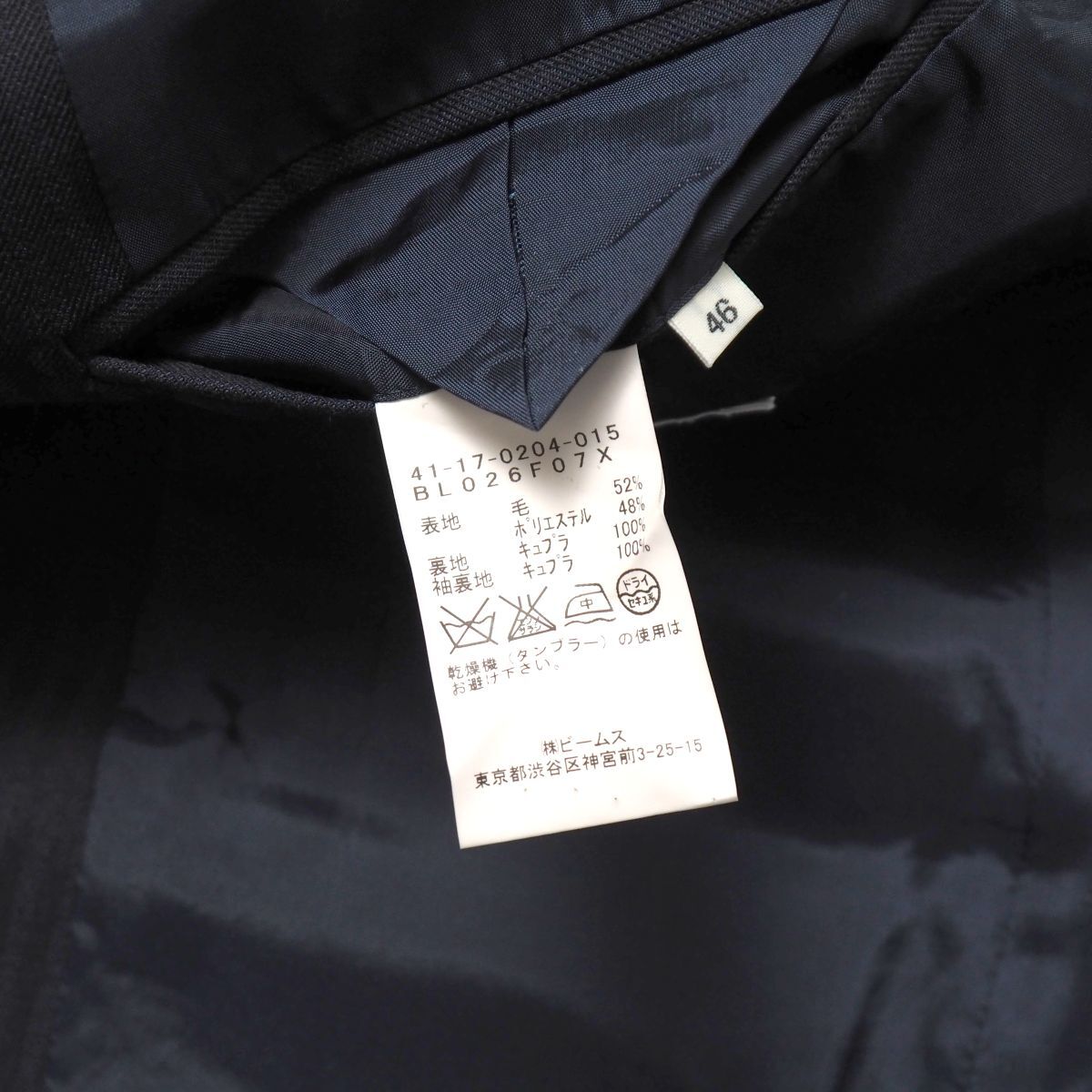 表地 毛52%ポリエステル48% 裏地 キュプラ100% 袖裏地 キュプラ100% 膝裏地 キュプラ100% |
