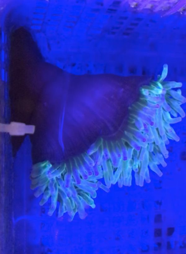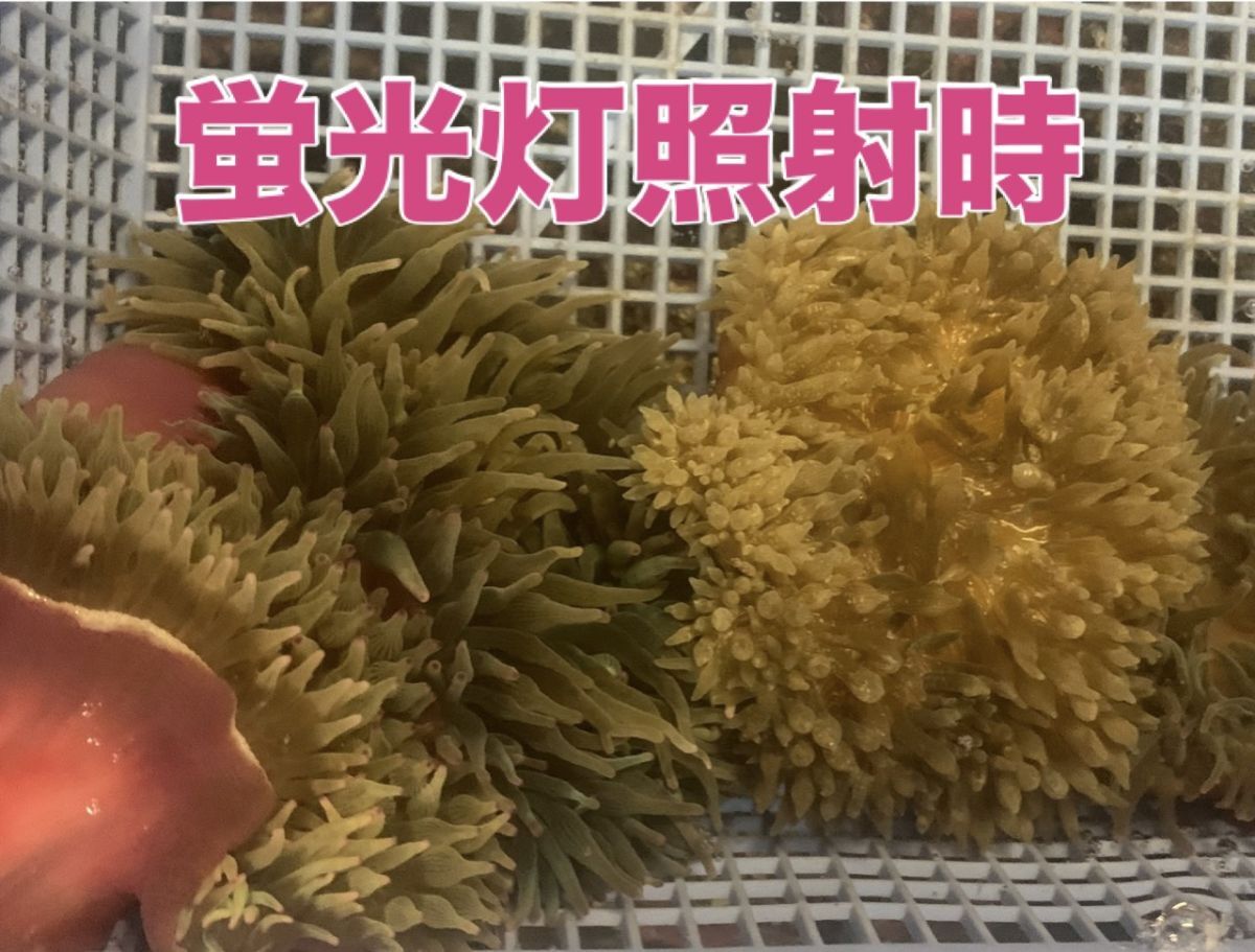 「箱を開けたらイソギンチャクがグリーンに光っていないぞ!」・・・蛍光灯では光りませんw