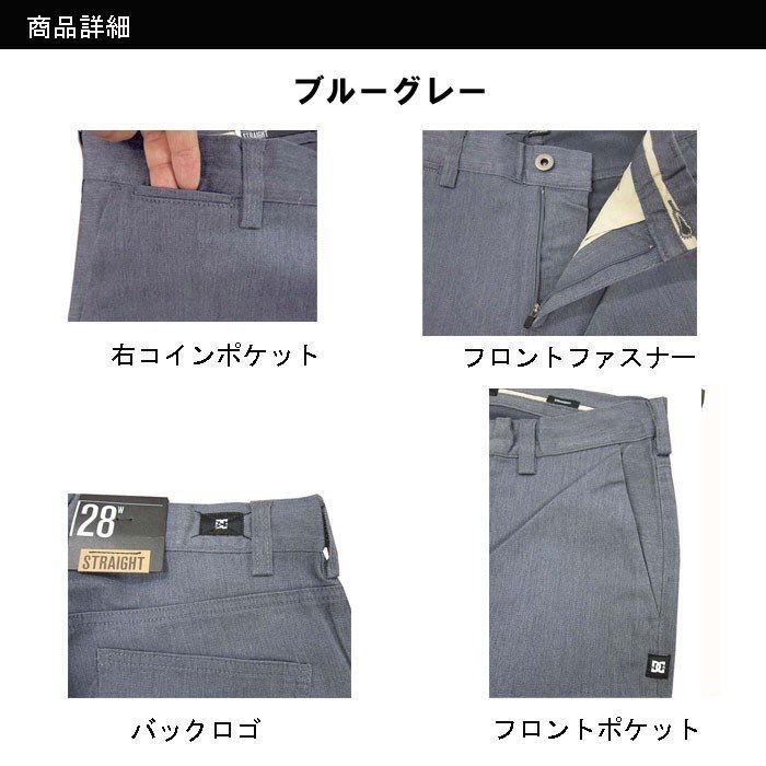 DCSHOE(ディーシーシュー)DC STRAIGHT WORKER PANT ストレートパンツ ブルーグレー ウエスト28インチ 股下32インチです。 ■サイズ ウエスト約74cm ヒップ約100cm もも周り約52cmまた上約24cm また下約78cm すそ幅約18cm ■素材 コットン60% ポリエステル39% スパンデックス1% ■特徴 幅広いコーディネートで大活躍のシンプルデザイン、コットンパンツの風合いにストレッチの効いた抜群の履き心地、そして、美しいストレートシルエットも見逃せない! ポケットは合計5箇所。 モデル 165cm 30インチ着用 | ||||||