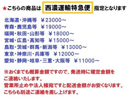 落札金額に対し消費税がかかります。 ★★①ヤフーストアーでの出品に付、ストアーから送信のオーダーフォームに必要事項の入力をお願いいたします。 ※メールで直接お問い合わせいただいた場合は当方からのメールにご返信をお願い致します 又オプションの追加をご希望の場合はご要望欄へ内容を記載して送信をお願いいたします ②地域や商品により送料の変動がある場合はこちらから再度、修正後のご連絡を送信させていただきます。 ③お振込みの場合は送金をお願い致します。 (落札金額 +送料 )×消費税が総額です。 ※振り込み手数料は落札者御負担でお願い致します。 ※代金引き換えの場合は (落札代金+送料 +代引き手数料)×消費税が総額になります。 ※特殊地域等で送料に変更が出る場合がございます。その場合は当社から再度計算してご連絡を入れさせていただきます ※!かんたん決済 がご利用いただけるようになりました。 !かんたん決済ご利用の際は、送料や合計金額が確定していない場合があります ので、こちらから合計金額をお知らせしてからのご利用をお願い致します。 ④落札者様から送金等とメールを頂いた後に、当方から入金確認及び商品発送等の御案内メールを送信させていただきます。 ※地域により送料の変更が入る場合は当社から変更後の、総額のご連絡入れさせていただきます ⑤商品到着で終了になります ※商品の出荷には2営業日~4営業日ほど必要になりますので御了承のほどお願い致します。 【西濃運輸特急便】 1個口:各地までの送料は送料表でご確認ください。 ![]() ●お届けは交通事情、運送会社の都合での変更、天候などの理由により、多少前後してしまう場合もございます。 ご指定の日時は大体の目安としてお考えいただきますよう、ご了承のほどお願い申し上げます。 お届地域によってはご希望の日時にお届けが間に合わない場合がございますのでご了承下さい。 ★業務時間はAM10~PM4、水曜日はメンテナンス、土曜、日曜日、夏季休暇、GW、年末年始は休業で業務を行えませんのでご了承のほどお願いいたします。 | ||||