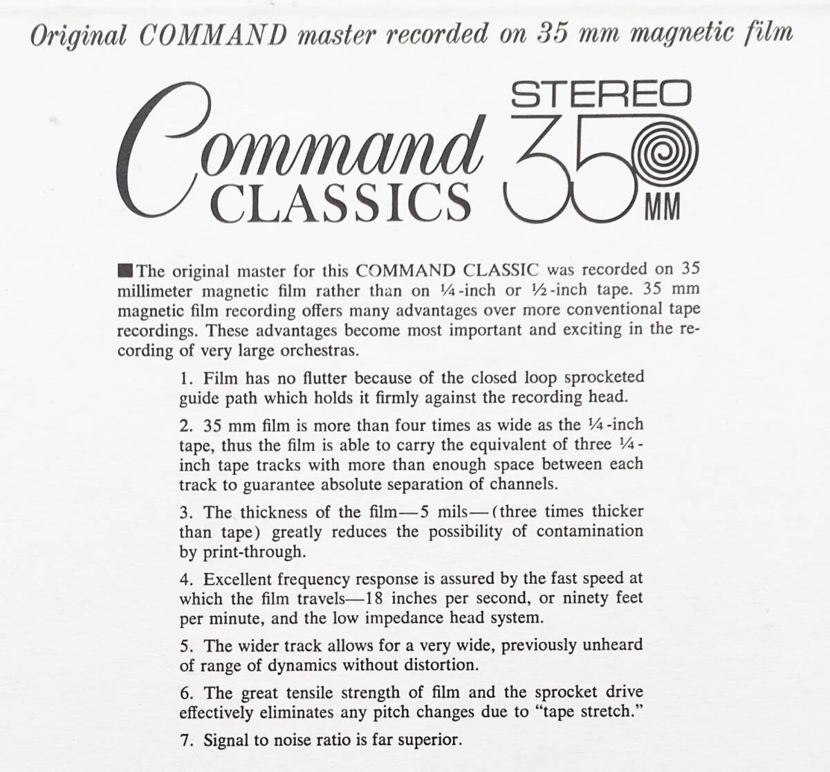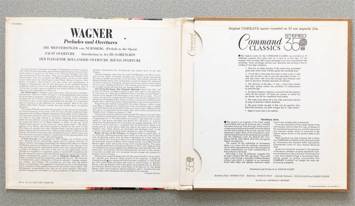 「Command Classics」シリーズの製品はイノック・ライトのこだわりを反映して大変豪華に作られています。分厚く重いジャケット(639gというボックス商品並みの重さがあります)は見開きの豪華な作りになっており、そこでは35mmマグネチック・フィルム録音が大々的に紹介されてワーグナー以上の主役になっているところにCommandの意気とオーディオ黄金時代の熱意が満ち溢れています。