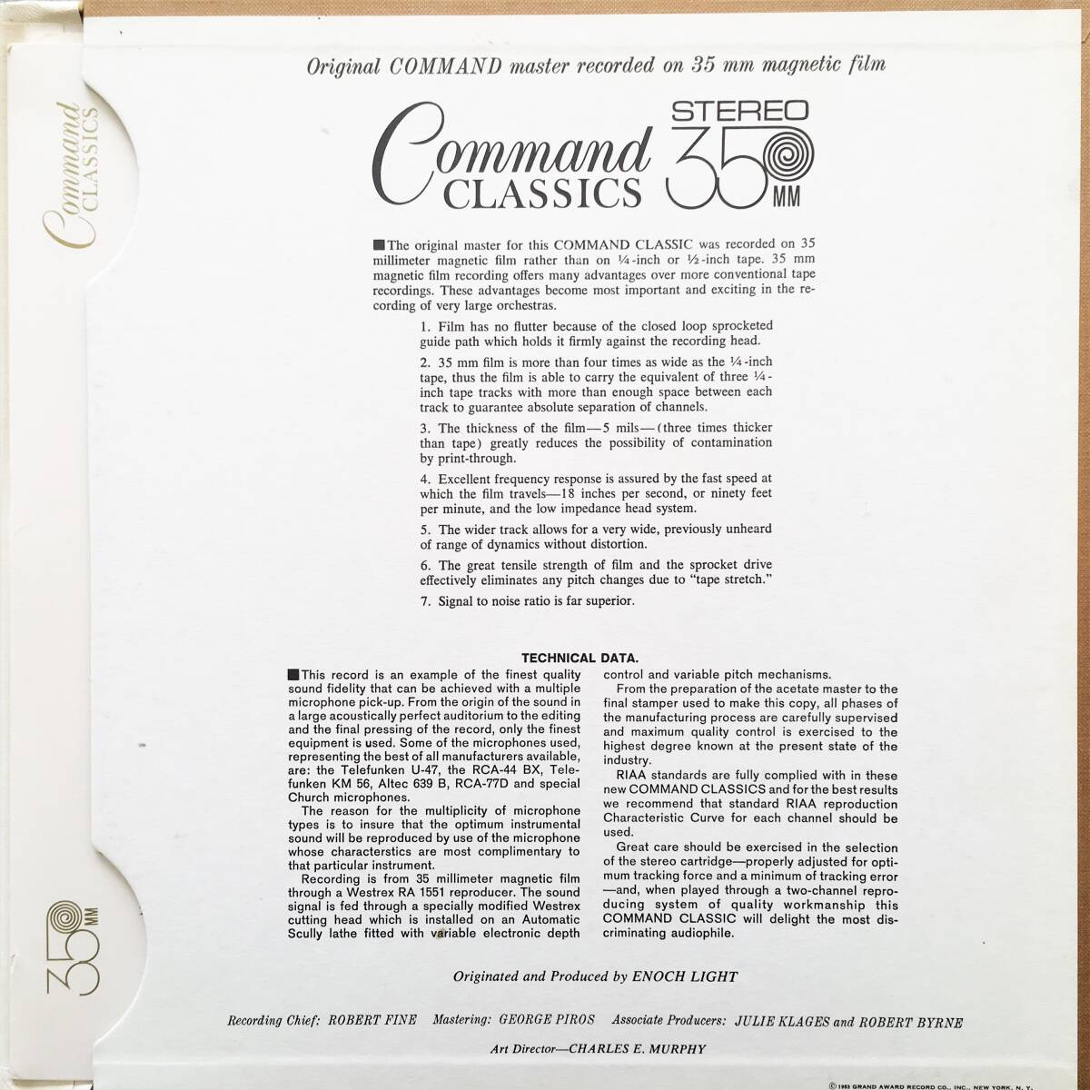 Mercuryの次にこの録音方式に飛びついたのがCommandでした。創始者のイノック・ライトは作曲者、編曲、指揮者という音楽家でありながら、究極のHi-Fiを求めるオーディオ・ガイであり、自身のレーベルCommandレーベルの制作を35mmマグネチック・フィルム録音システムで収録してゆきました。Commandはもともとポピュラー系の音楽を厚くレーベルでしたが、ライトは「Command Classics」というレーベルを新設し、本格的なウルトラHiFiのクラシック・レコードを世に送り出しました。Command Classicの一番のアーチストは昔からAudiofileと案の深いウイリアム・スタインバーグでした。