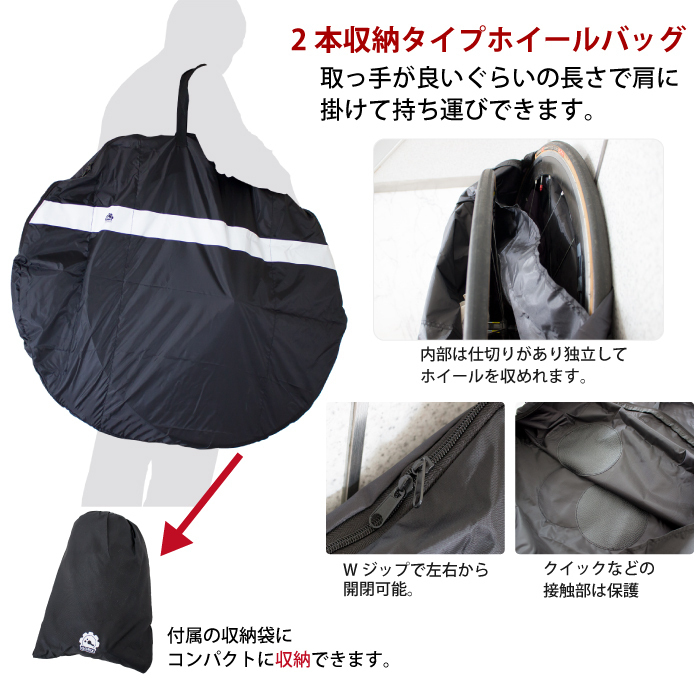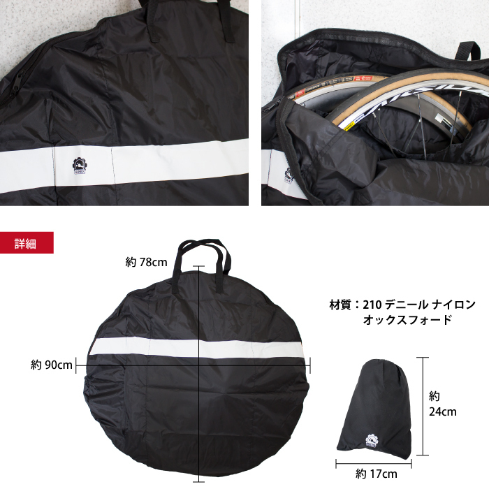 | ロードバイクや、クロスバイク、MTBのホイールを持ち運べるホイールバッグ。 車の中や保管用にも最適です。 いい長さの取っ手は肩に掛けて持ち運び可能です。 700c又26ホイールをタイヤにつけたままいれられます。 ・内部は仕切りがあり、独立してホイールの収納ができます。 ホイール同士バッティングする事はありません。 ・収納袋付属なのでとてもコンパクトにしまえます。 ・自転車のホイール2本収納可能です。 サイズ(約):90×78cm(内部:仕切りあり横幅65cm) カラー:ホワイトライン 材質:210 デニール ナイロンオックスフォード 付属:ホイールバッグ、専用収納袋 | |