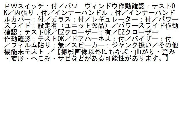 | 商品情報 | PWスイッチ:付/パワーウィンドウ作動確認:テストOK/内張り:付/インナーハンドル:付/インナーハンドルカバー:付/ガラス:付/レギュレーター:付/パワースライド:設定有(ユニット欠品)/パワースライド作動確認:テストOK/EZクローザー:有/EZクローザー作動確認:テストOK/ドアハーネス:付/バイザー:付/フィルム貼り:無/スピーカー:ジャンク扱い/その他機能未テスト /【撮影画像以外にもキズ・曲がり・歪み・変形・へこみ・サビなどがある可能性があります。】 | ||
