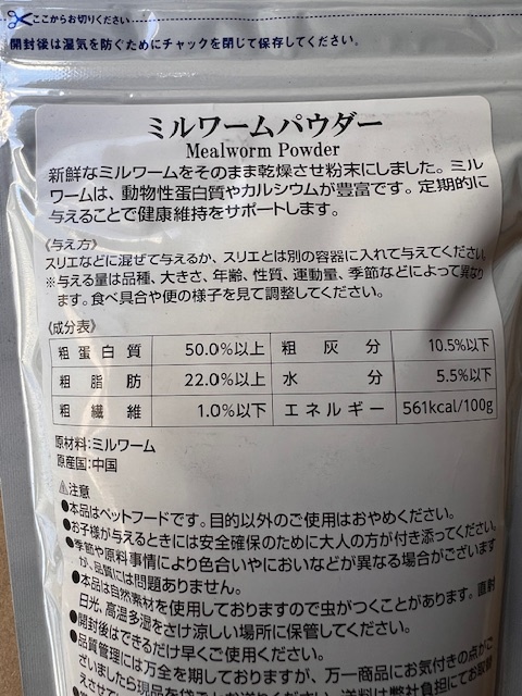 | * 商品説明 * 動物性たんぱく質とカルシウムが豊富なミルワーム。 粉末タイプなので与えやすく、小鳥の健康維持をサポートします。 中国産 100g入り×12袋セット 賞味期限2026.03月末 ※商品重量約1340g 未使用新品ですがパッケージにやや汚れがあります。 在庫処分品とご理解の上ノークレームノーリターンでお願いします。 | ||||||||