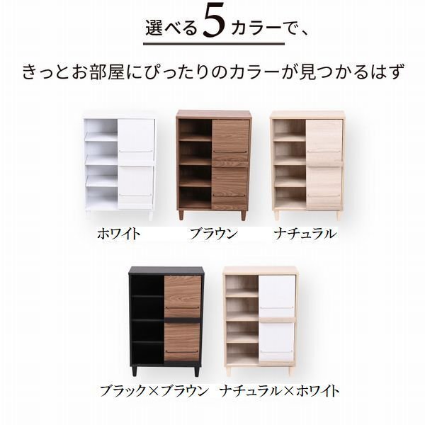 | 【カラー】 ホワイト、ブラウン、ナチュラル、ブラック×ブラウン、ナチュラル×ホワイト 【サイズ】 <外寸> 幅60×奥行29.5×高さ90(アジャスター80.5)cm <内寸> オープン部:各幅56×奥行24.5×高さ37cm 可動棚:幅56×奥行25×厚み1.5cm(3.2cmピッチ5穴) フラップ部1段目:幅24.5×奥行1.5×高さ35.5cm フラップ部2段目:幅24.5×奥行1.5×高さ36cm 【材質】 <ホワイト> 本体:プリント紙化粧合板 天板・扉:合成樹脂化粧合板(PVC) 脚:天然木 <ブラウン、ナチュラル> 本体:プリント紙化粧合板 脚:天然木 <ブラック×ブラウン> 本体:プリント紙化粧合板 天板:合成樹脂化粧合板(PVC) 脚:天然木 <ナチュラル×ホワイト> 本体:プリント紙化粧合板 扉:合成樹脂化粧合板(PVC) 脚:天然木 【耐荷重】 天板:(約)10kg以下 フラップ扉:各(約)1.5kg以下 可動棚:各(約)5kg以下 扉内固定棚:各(約)5kg以下 【生産国】 中国 【梱包】 サイズ:82.5×42×15.5cm、重量:14.8kg 【その他】 ・可動棚2枚 ・背面化粧なし ・脚裏フェルト付き ・アジャスター付き 【組み立て品】 お客様による組み立てが必要です。 【ご注意】 ・サイズ、重量は概算です。 ・商品カラーはご使用のモニターによって実際の明るさや色と異なって見える場合がございます。 |