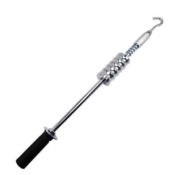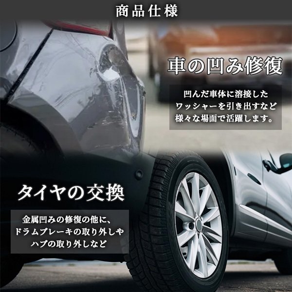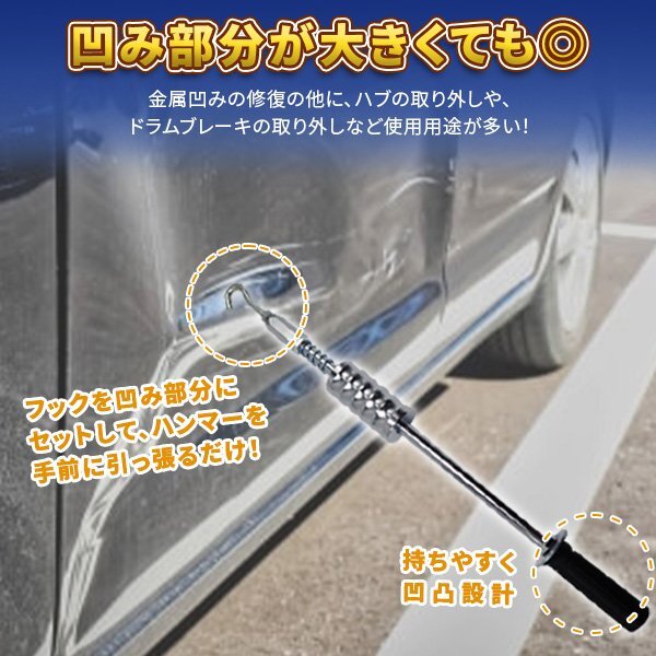 | 商品説明 | 〇板金加工等に使用可能なスライドハンマーになります。 凹んだ車体に溶接したワッシャーを引き出すなど様々な場面で活躍します。 〇金属凹みの修復の他に、ハブの取り外しや、ドラムブレーキの取り外しなど使用用途は多く、応用が効きます。 〇スライドハンマーのフック部分を金属の凹みにセットし、 グリップを手前に引っ張ることでハンマーの様に力を加えることができます。 〇グリップの凹凸は持ちやすいよう設計されており、安定した状態で作業が可能! 【商品情報】 ・シャフト径:16mm ・先端フック部シャフト径:8mm ・ハンマー長さ:120mm ・ハンマー径:5mm ・グリップ長さ:180mm ・全長:620mm ・全重量:2.2kg