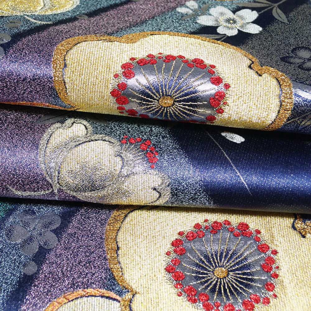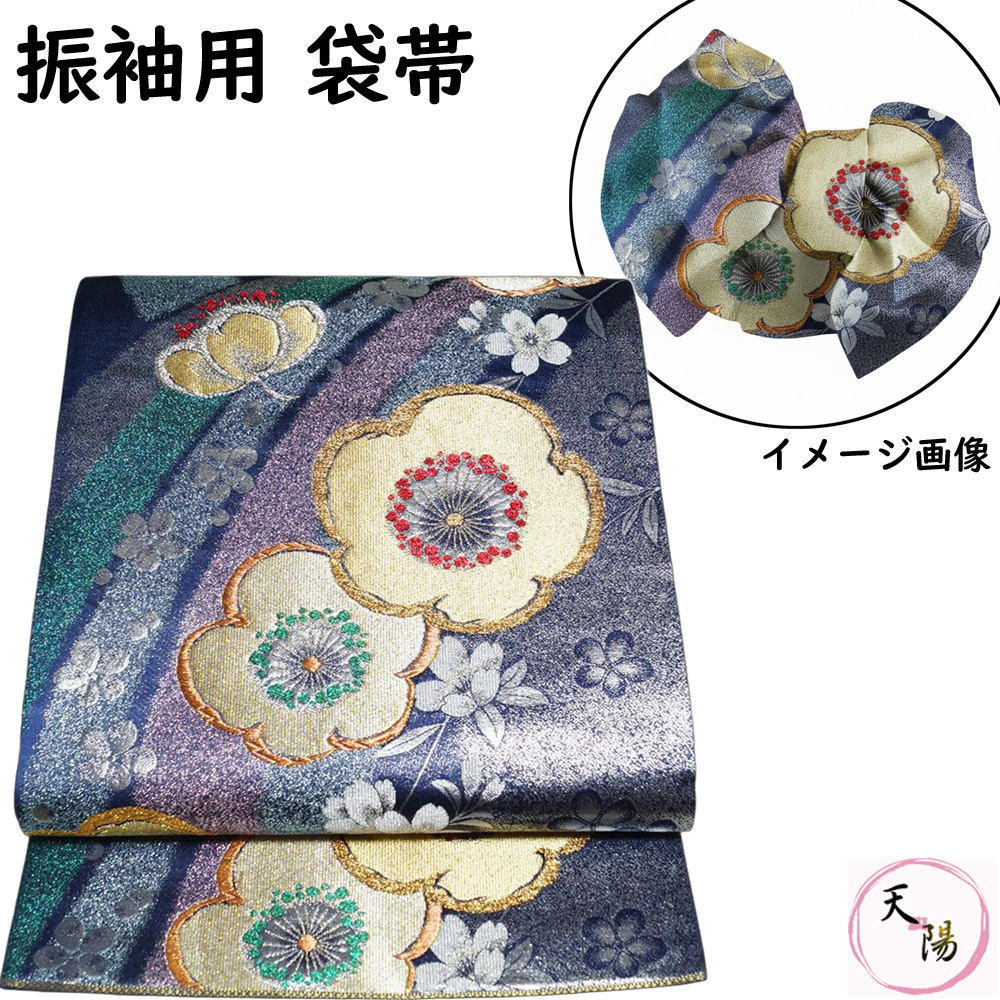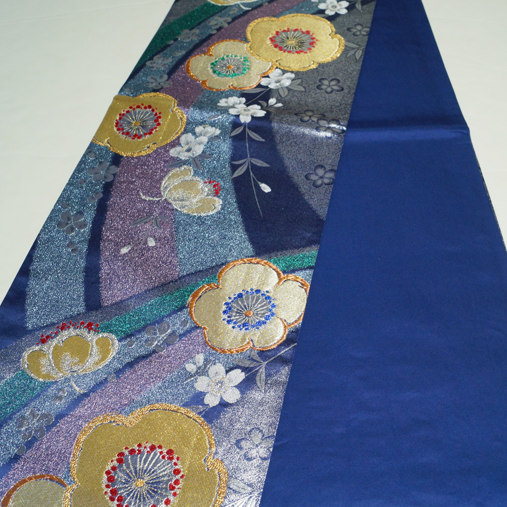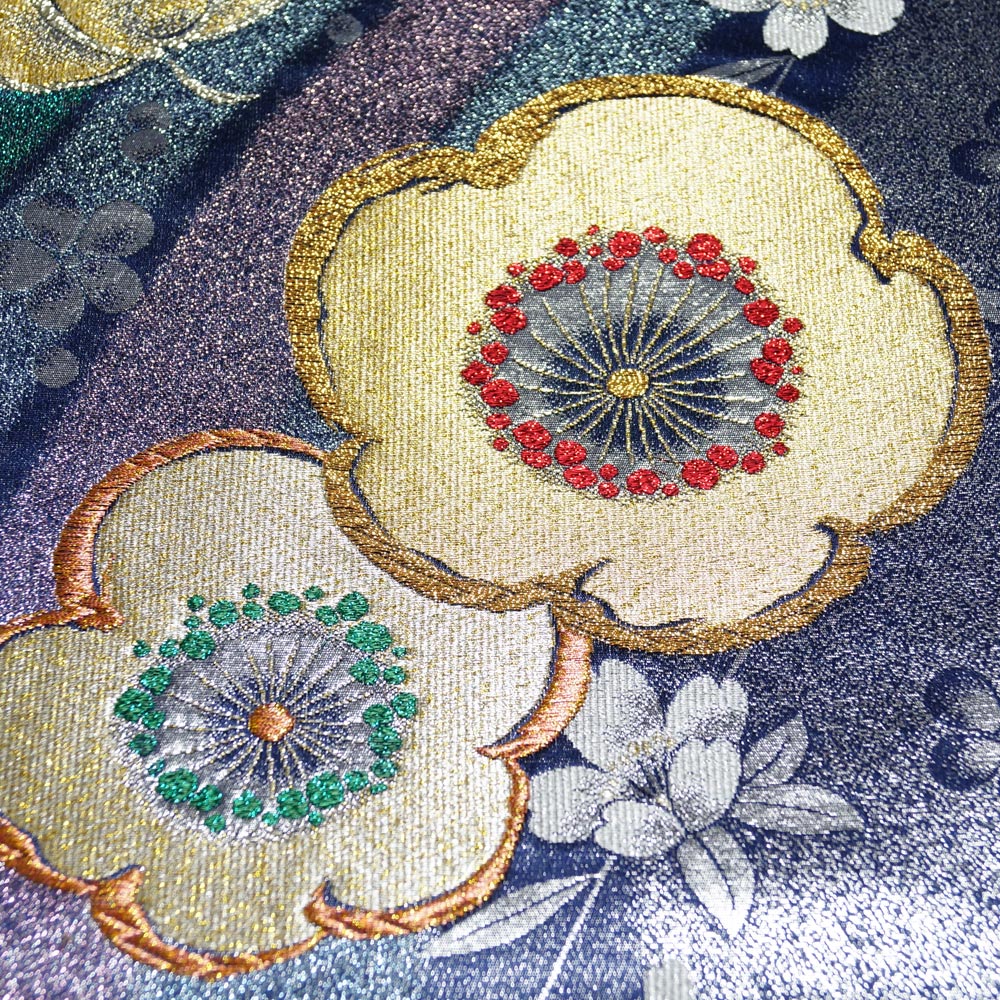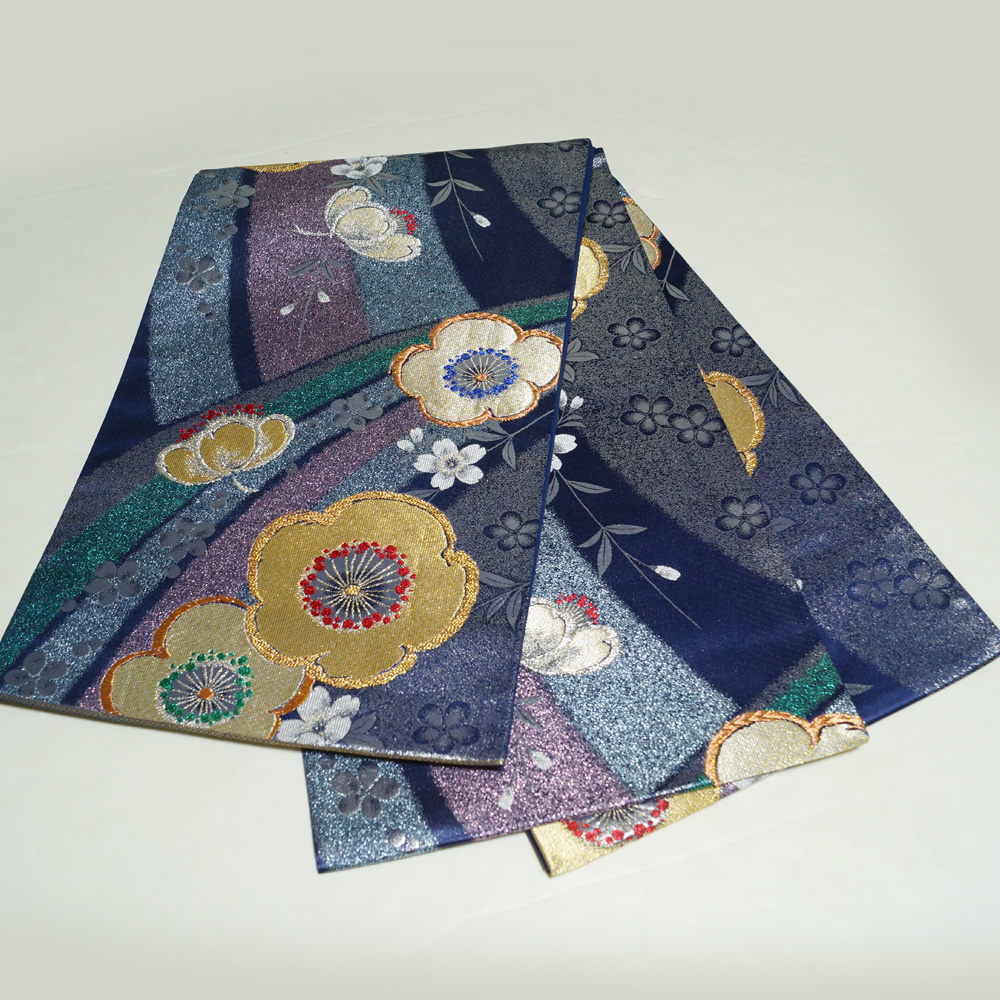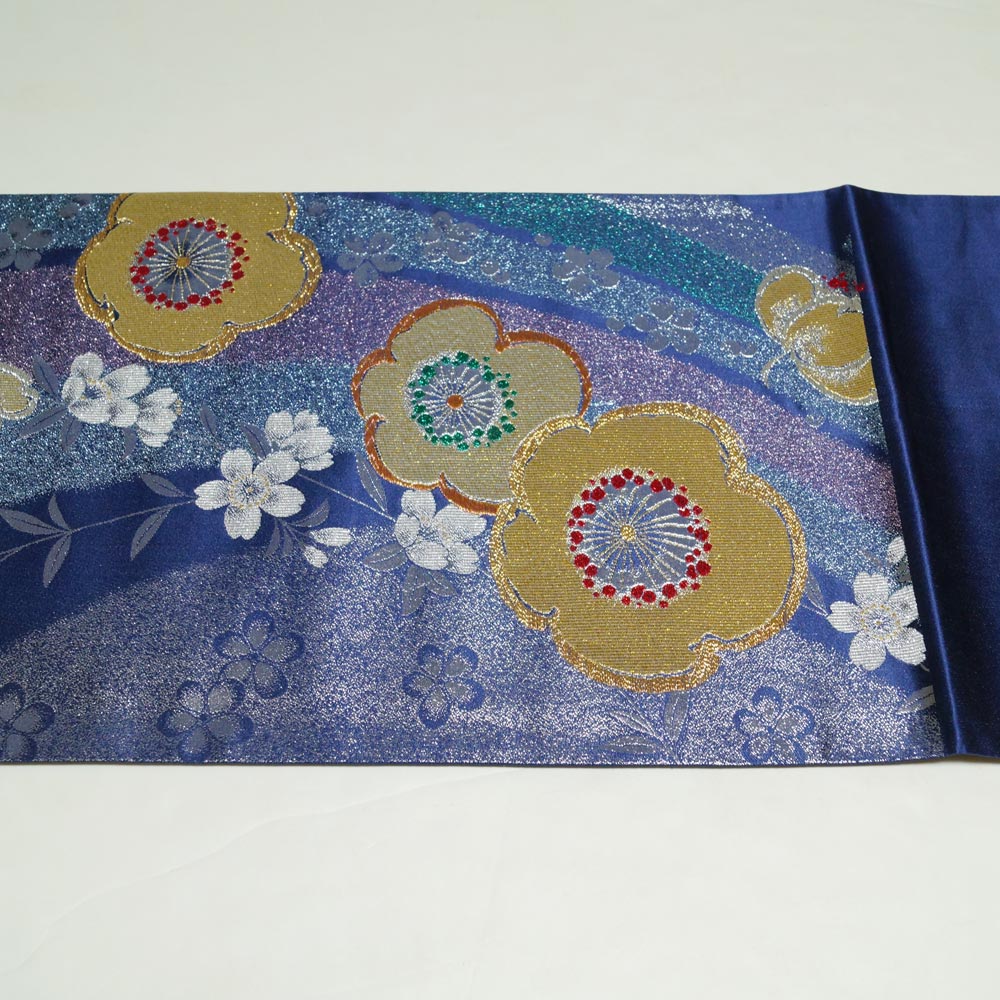 | 商品 説明 | 紺色系の地に金銀糸・ラメ糸のラインに梅・桜などの模様が織られた袋帯です。 振袖向きの帯となります。 |