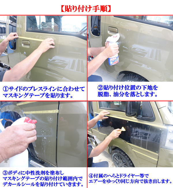 | 商品説明 | ダイハツ ハイゼットジャンボ S500P S510P 前期後期共通 キャビン部分&荷台三方開部分 サイドデカール シール シルバーグレー デザイン PVC材質 ※ハイゼットジャンボS500 S510P系 前期後期共通 キャビン部分左右と荷台の三方部分のセット。 【商品説明】 ※ダイハツ ハイゼットジャンボ 前期後期共通 キャビン部分 サイドデカールシール シルバーグレーカラーデザイン タイプです。 ※2014年9月 平成26年9月~の前期型 令和3年11月~後期型 ハイゼットジャンボ S500P S510P前期後期に適合します。 ※色褪せのしにくい、耐久性のあるPVC材質で、貼り付け後は、はがれにくい材質で、しっかりとボディに馴染む材質です。寿命も長く、色褪せしにくい材質です。 ※貼り付け前には、ボディ側の汚れやWAX分をきれいに脱脂し、油分を落としてから、中性洗剤等で、ボディ側に水分を吹き付けながらゆっくりと貼り付けしてください。 ※詳しい貼り付け方法の説明を商品ページ上に動画を掲載しておりますので是非、ご参照ください。 ※貼り付け用のへらが付属いたしますので、ゆっくりとドライヤー等で表面を温めながらへらを使用しエアー空気が入らないように貼り付けしてください。 ※デカール裏面と、ボディ表面にできるだけ多くの水分を吹き付けして、表面を一方向にへらで空気を抜いて、ボディにしっかり馴染ませたあとにゆっくり位置決めをして完成です。 ※粘着力が上がってくるまで、数時間おいておきます。貼り付け後のスチーム洗車等はお控えください。 ※商品は丸形の筒状の段ボール梱包で発送いたしますので、貼り付け前に平面の状態に馴染ませてください。 ※他にも、ハイゼットジャンボの荷台部分のサイドシールデカール艶消しマットブラックデザイン、きめ細かいカーボン調デザイン、シルバーグレーデザインの3種類を販売しております。そのほかにも、ハイゼットトラック系のドレスアップパーツも多数販売しておりますので、そちらもご検討ください。 ※全国送料無料にて発送いたします。 ※こちらは発送のみの扱いになりますのでお引き取り等は対応しておりません。 ※その他、表面に細かい擦れ等がある場合がありますので、完璧をお求めの方、神経質な方はご参加ご遠慮ください。 ※当方ではすべての説明やサポートはできません。詳しい説明はいたしかねますのでお分かりになる方のご入札でお願いいたします。 ●管理番号 3176 ハイゼットジャンボ S500 S510P キャビン部分 サイドシール サイドデカール 左右荷台三方 シルバーグレーカラー |