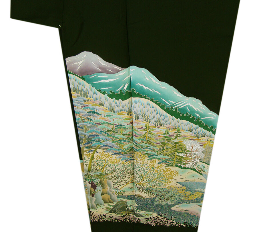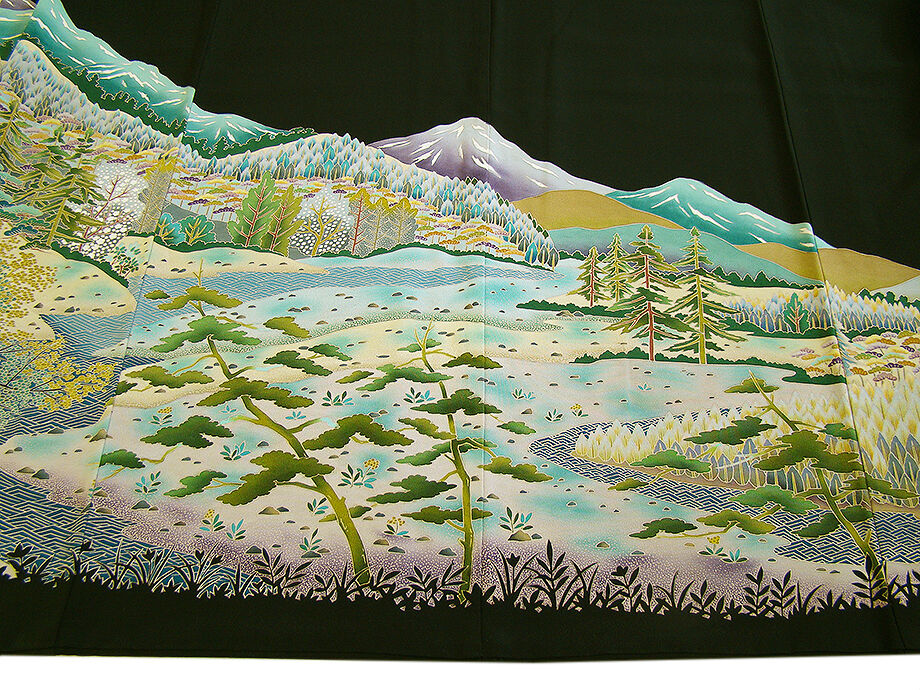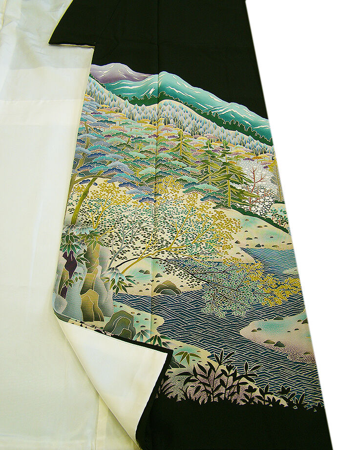※本加工染の黒留袖です。 新郎新婦のお母様や、お仲人さんにぴったりでしょう。 日本情緒の趣が匂いたち繊細に染成した脈々と受け継がれた色彩感覚が、見る人を魅了する品物です。 40代~70代の身長155cm~161cmの貴女に最適です。 |