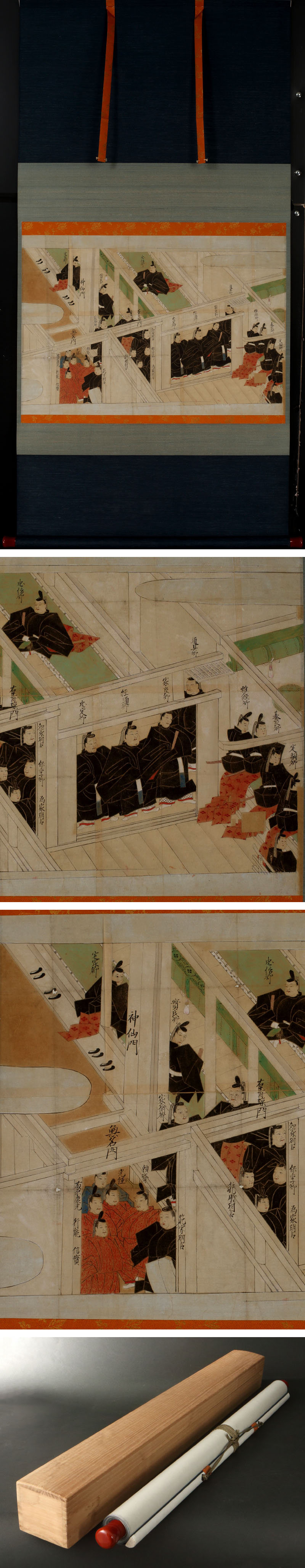 江戸後期の中殿御会図です。 中殿御会は建保6(1218)年、順徳天皇が宮中清涼殿(中殿)で催した詩歌管絃の御会で、天皇が琵琶「玄象」を奏で、31人の公卿が詩歌管絃に参加したといわれます。その様子は似絵の名人・藤原信実により活写され、能書家・世尊寺行能が披講和歌を書写した絵巻物に仕立てられたといわれますが、原本は早くに消失したと見られ、摸本や白描で伝わりました。 この御会には藤原定家や為家の姿もみられ、当代随一の文化人を揃えた後鳥羽上皇の威光の頂点であり、承久の乱直前の「新古今」爛熟期の公家文化を象徴するものとして、殿上人の懐古の対象だったのでしょう。極彩色での再現が試みられた逸品です。 ◆中殿御会図 建保6(1218)年、順徳天皇が宮中清涼殿(中殿)で催した詩歌管絃の御会の様子を描いた絵巻。似絵の名手たる藤原信実が絢爛たる宴の様子を描き、能書家世尊寺行能が披講和歌を書写したといわれる。原本はすでに失われ、九条家に伝わった白描の模本(1巻・北村家蔵。鎌倉時代・13世紀)が最古の作品とされる。 付属:時代箱が付属します。 寸法:縦137cm、横68cm(最大幅。若干の誤差はご了承下さい) 状態:経年のイタミがございます。 |