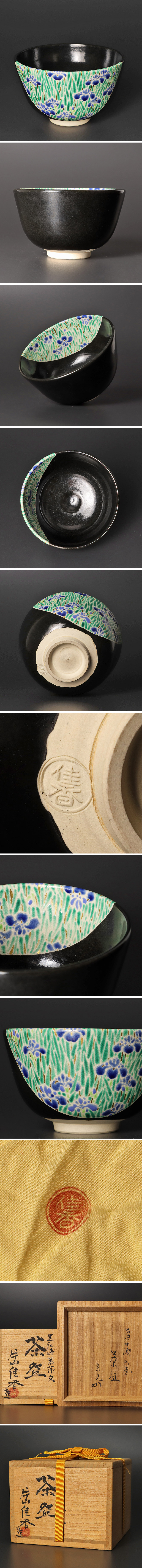 | 【古美味】片山佳香造『堀内宗完(兼中斎)書付』黒仁清菖蒲文茶碗 茶道具 保証品 |