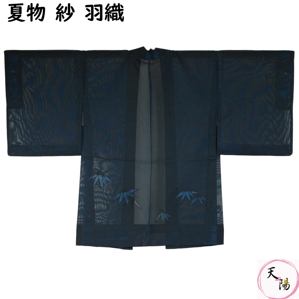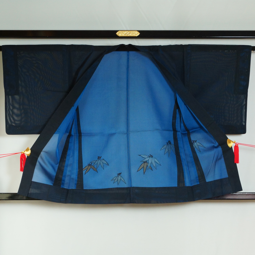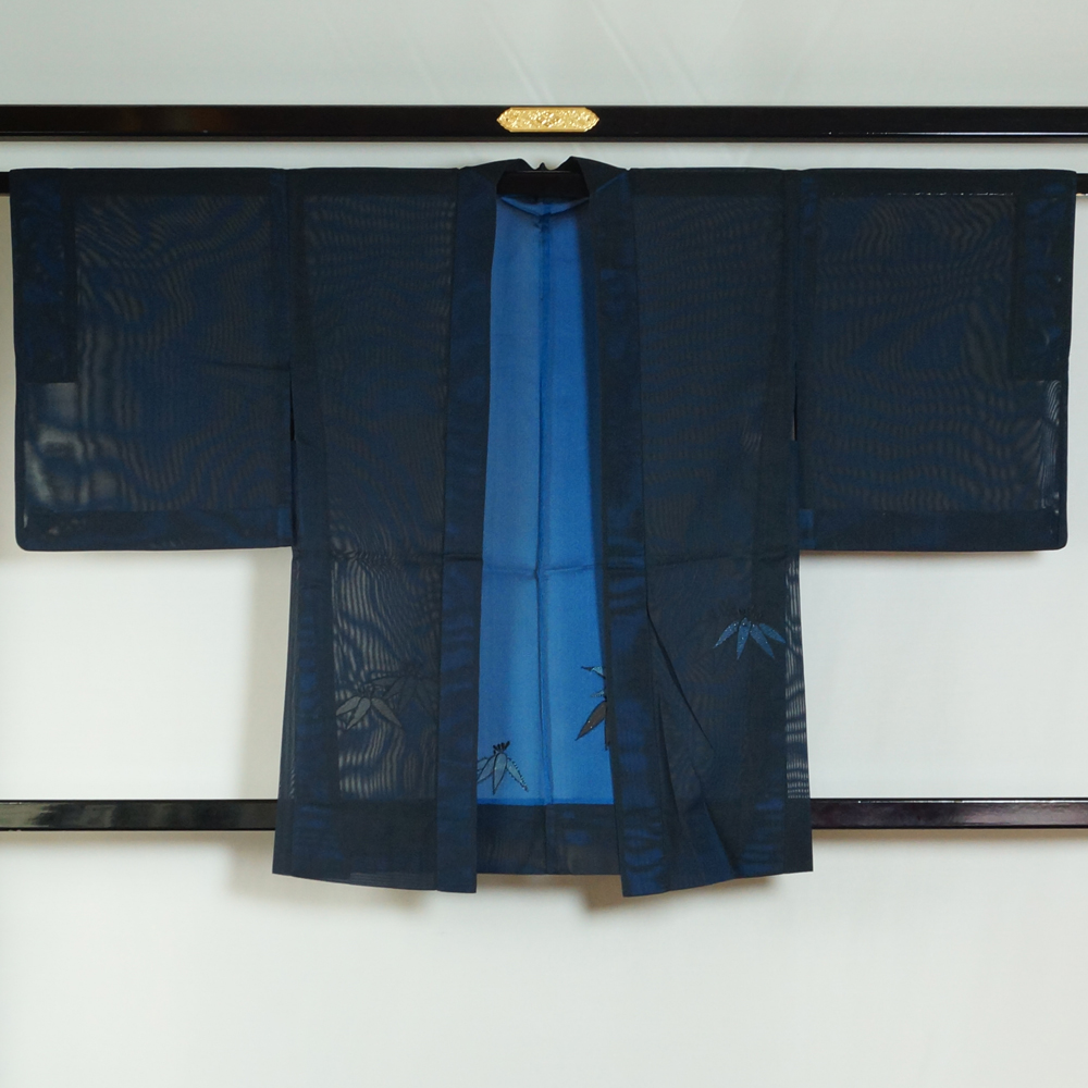 | 品 名 | 夏物 羽織 紗 Sサイズ 羽織紐無し 笹模様 黒・青色系 正絹 【中古 羽織り 夏 羽織もの レディース 羽織もの 夏 リサイクル 夏 夏着物 夏用 着物 単衣 塵除け コート リサイクル着物 】 | ||