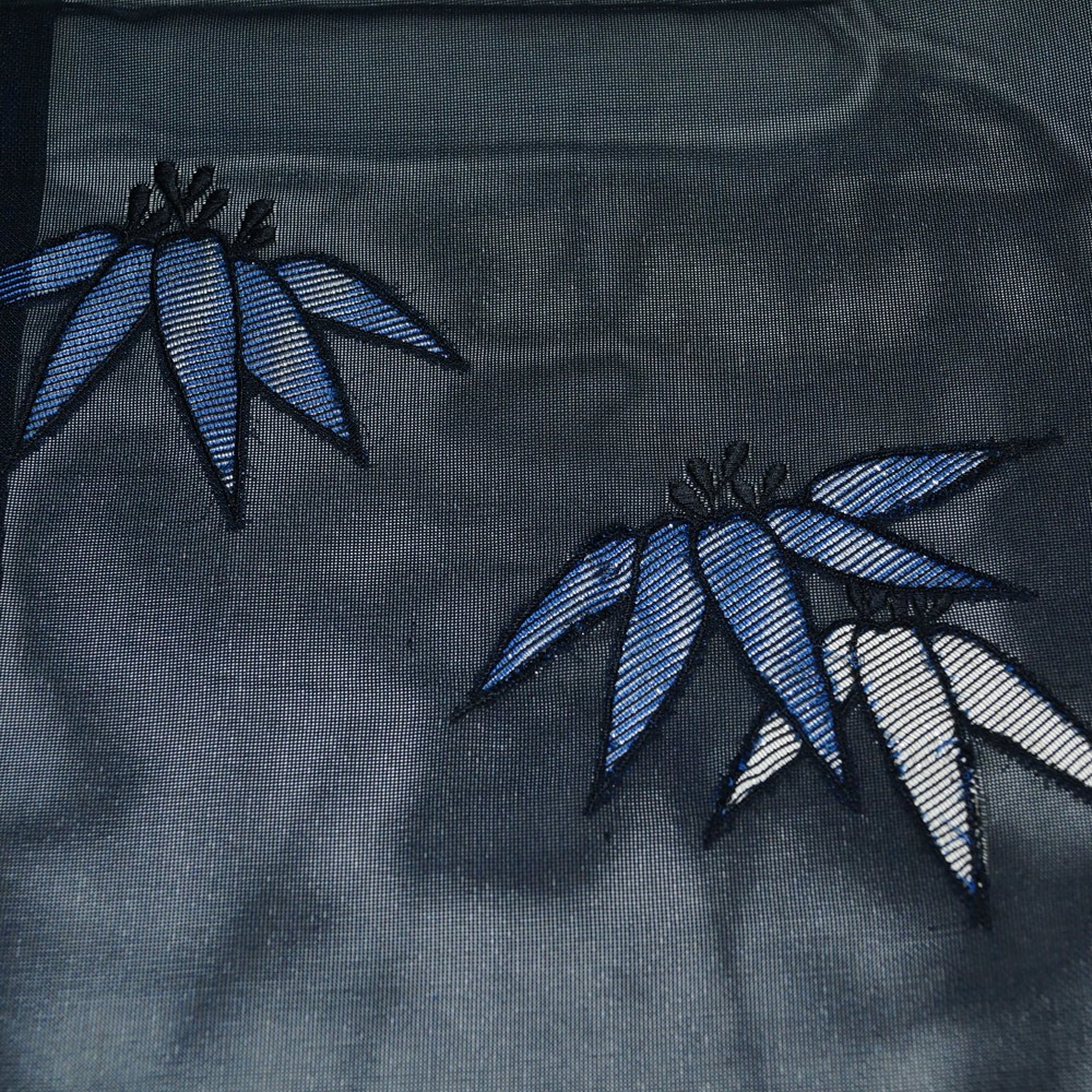 | 商品 説明 | 黒色系の紗地に笹模様の刺繍が施された単衣・夏物用の紗の羽織です。羽織紐は付いておりません。裏地は青色系となっており、色味が薄っすらと透かして見えるようになっております。 |