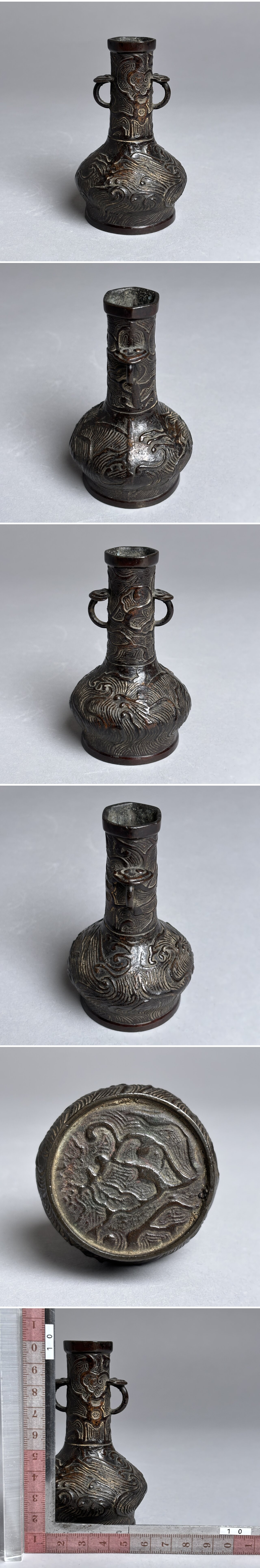 古銅 鋳造 花瓶 双耳壺 波涛文 時代物 中国美術 唐物 古玩 骨董品 金工芸 花器 JB2602B-001 |