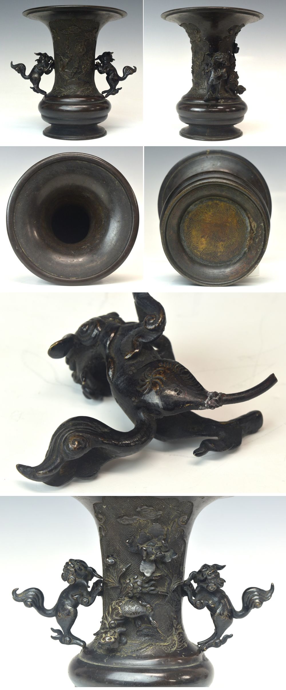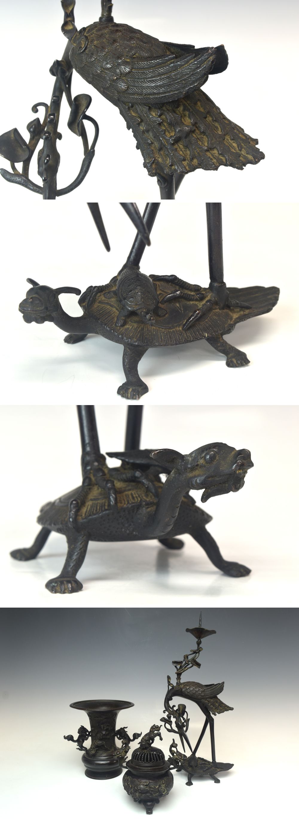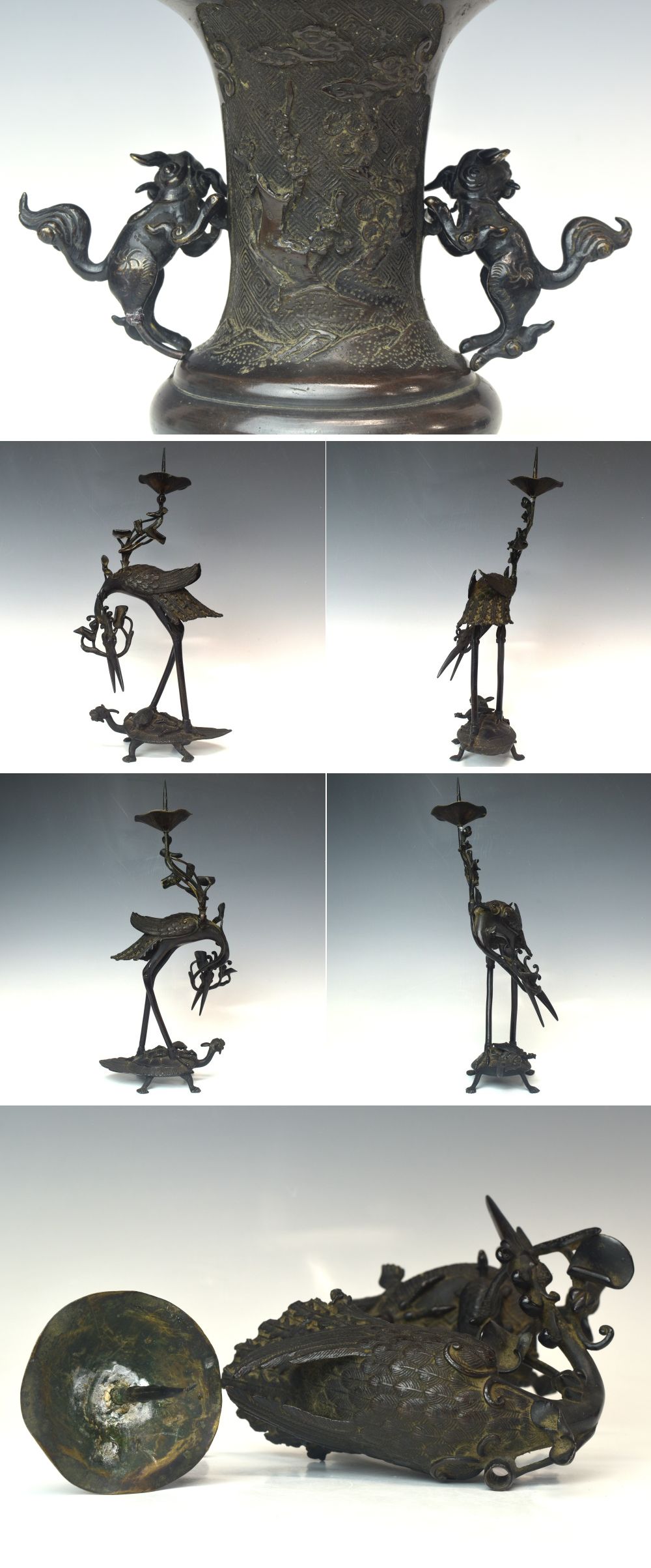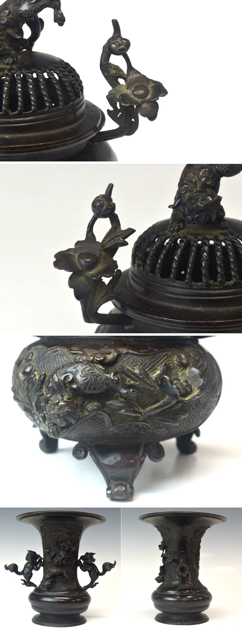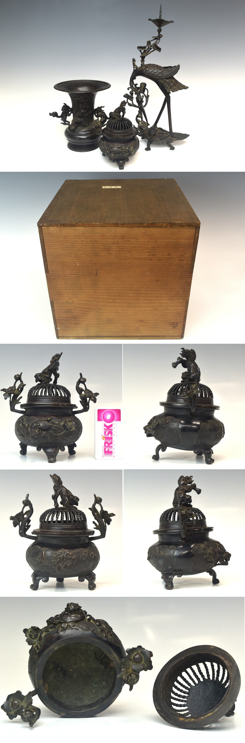 | 説明 | 時代のある古銅の三具足です。 細部まで丁寧に造られており時代を経た味わい深い三具足です。 良質な銅材の為、ズッシリとした重量感があります。 花瓶の獅子の足に修復後がありますが全体的に目立った痛みはありません。 この機会をお見逃し無く! この他にも多数出品しておりますので宜しければご覧ください。 商品代金+消費税+送料の合計がお支払い代金となります。 |