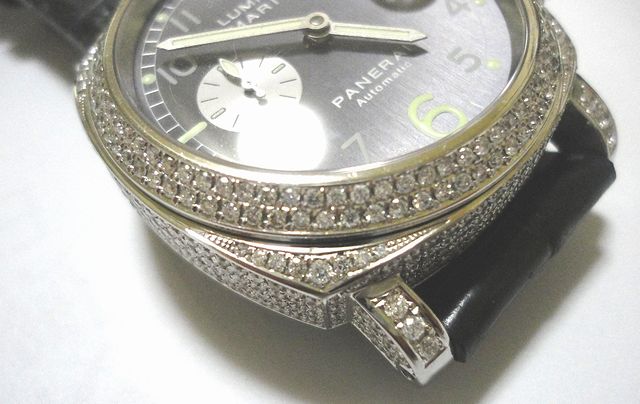 | パネライ ルミノールマリーナ 44mm ベゼル、ラグ、リューズカバー、ベルト付け根部分、バックルに天然ダイヤモンドを加工します。 | |||